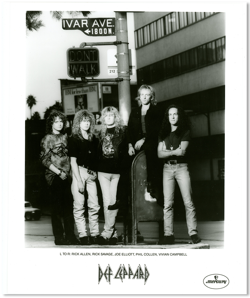 Black and white promotional photo of Def Leppard for Mercury Records 1992/93. Joe Elliott, Phil Collen, Rick Savage, Vivian Campbell, Rick Allen are standing on the corner in Los Angeles, CA underneath the sign for Ivar Avenue. From the collection of Def Leppard.