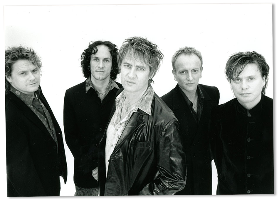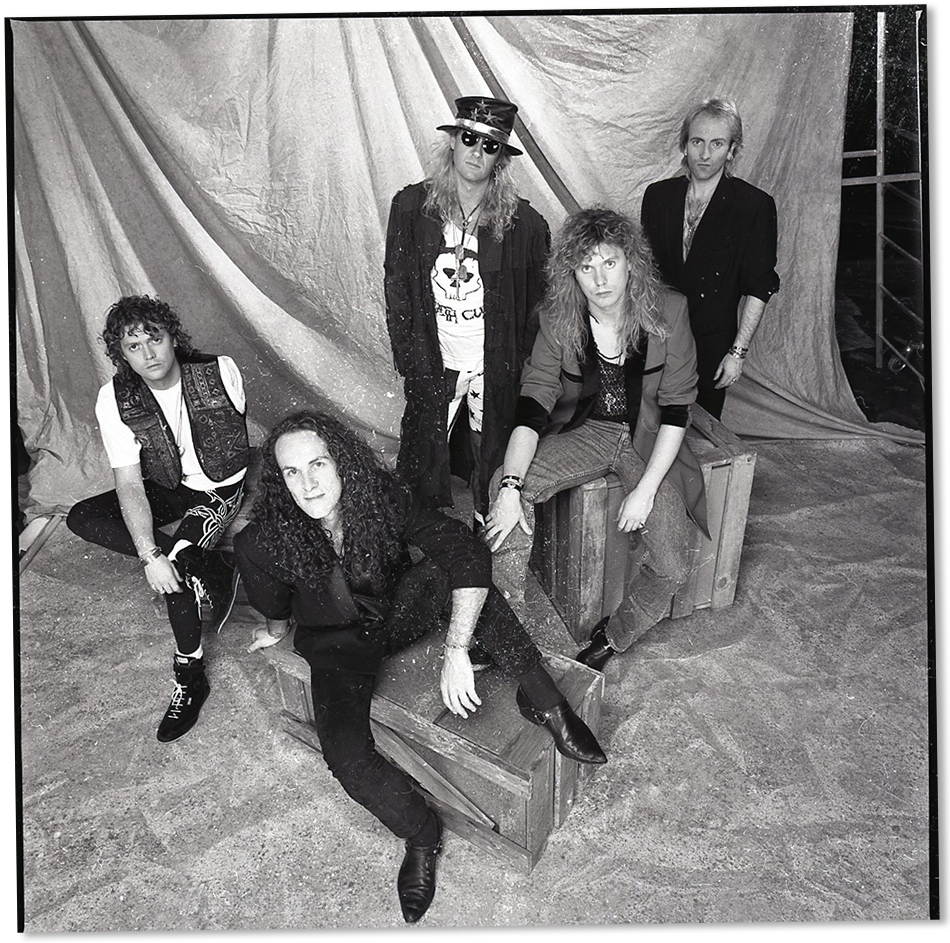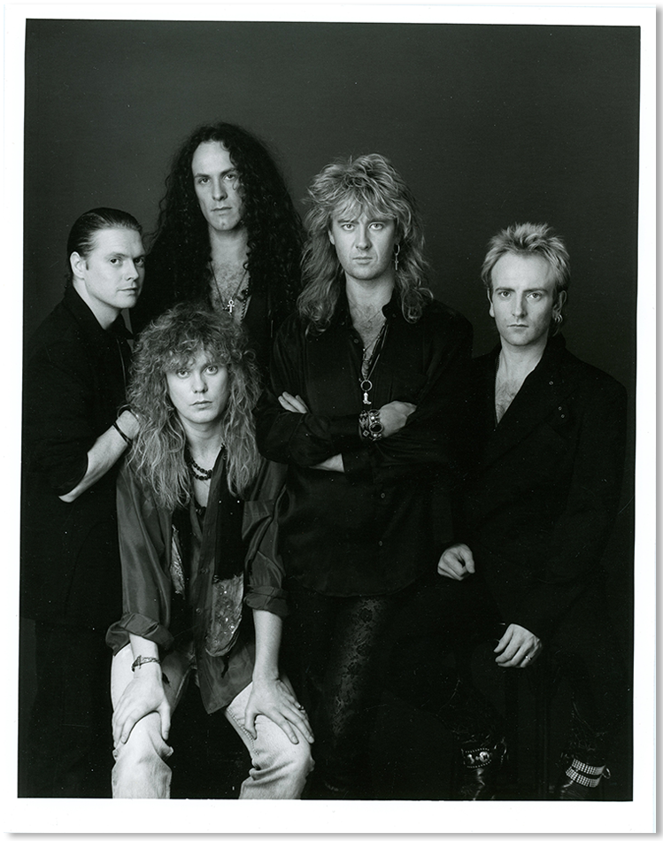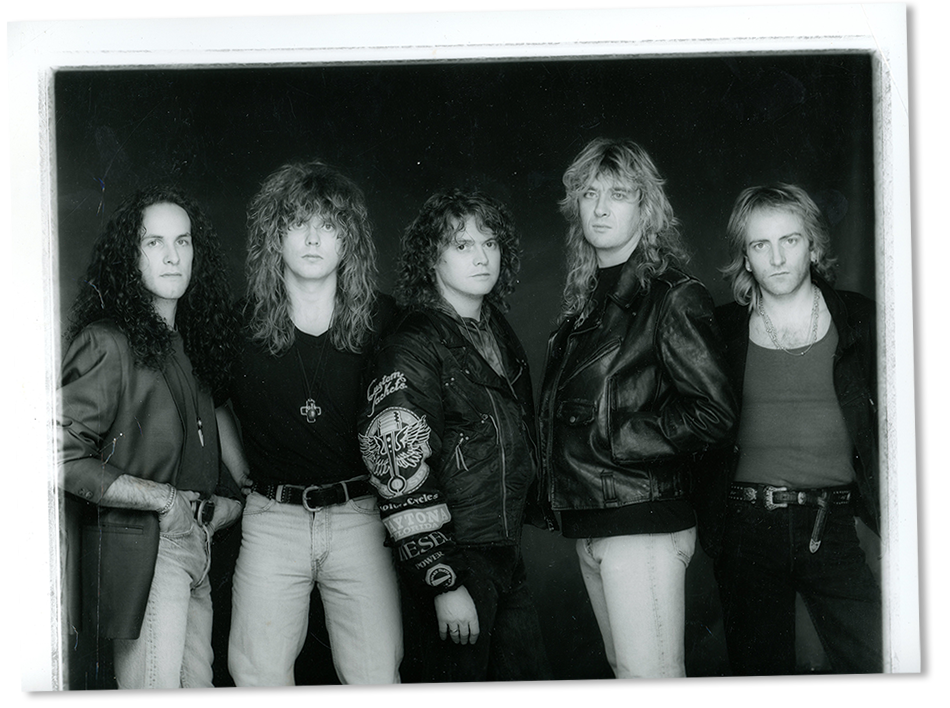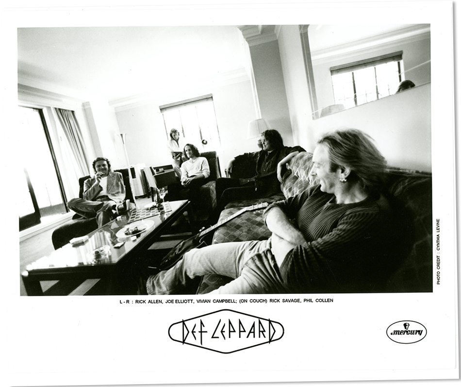 1992 black and white promotional photo of Def Leppard for Mercury Records. Joe Elliott, Phil Collen, Rick Savage, Vivian Campbell, Rick Allen. From the collection of Def Leppard.