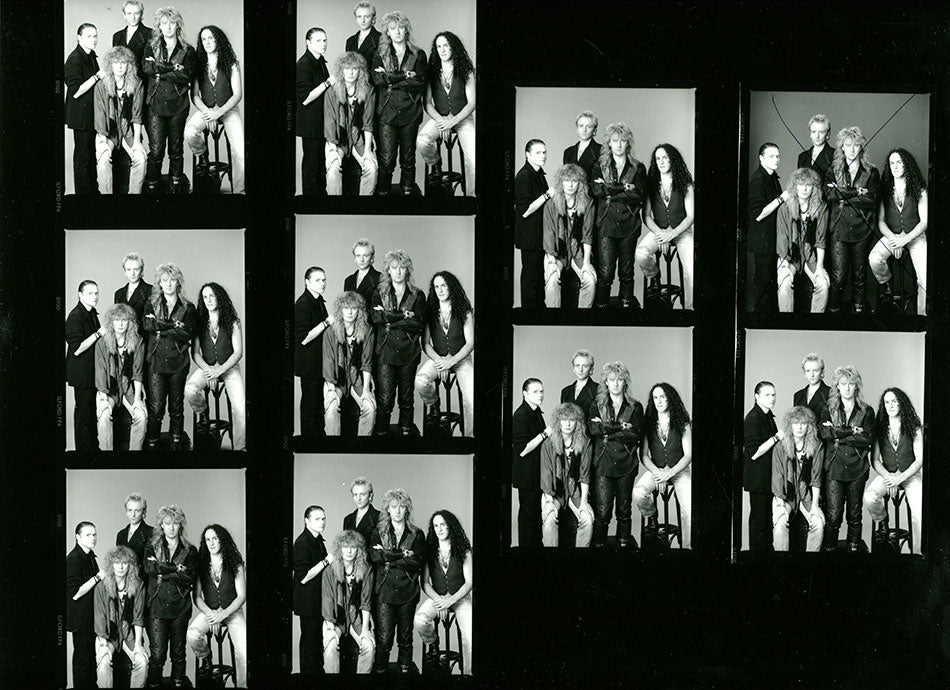 Black and white contact sheet from a 1992 shoot in Dublin with ten images featuring Joe Elliott, Phil Collen, Rick Savage, Vivian Campbell, and Rick Allen. Looks like the image on the top right didn't make the cut! From the collection of Def Leppard.