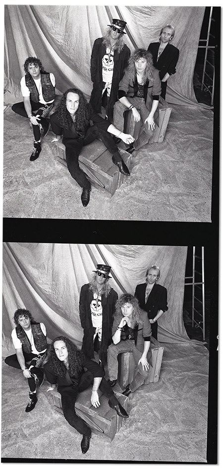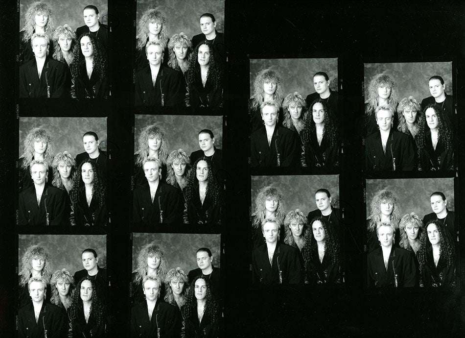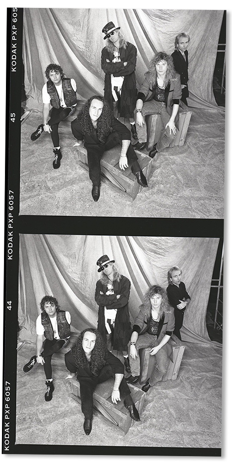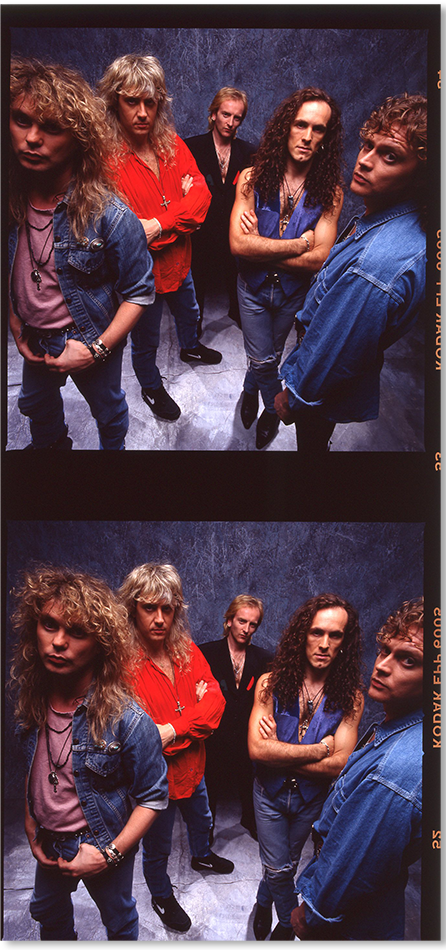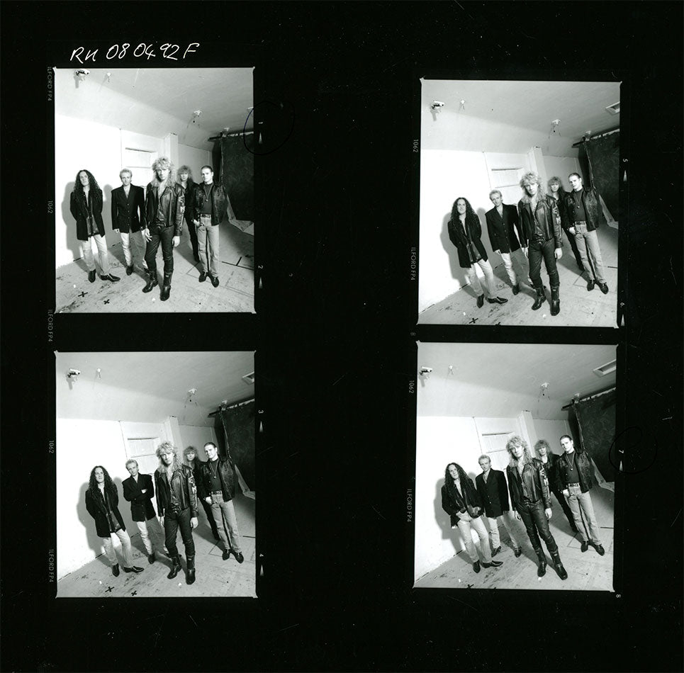 Color negative strip of Joe Elliott, Phil Collen, Rick Allen, Rick Savage, and Vivian Campbell from 1992. From the collection of Def Leppard.