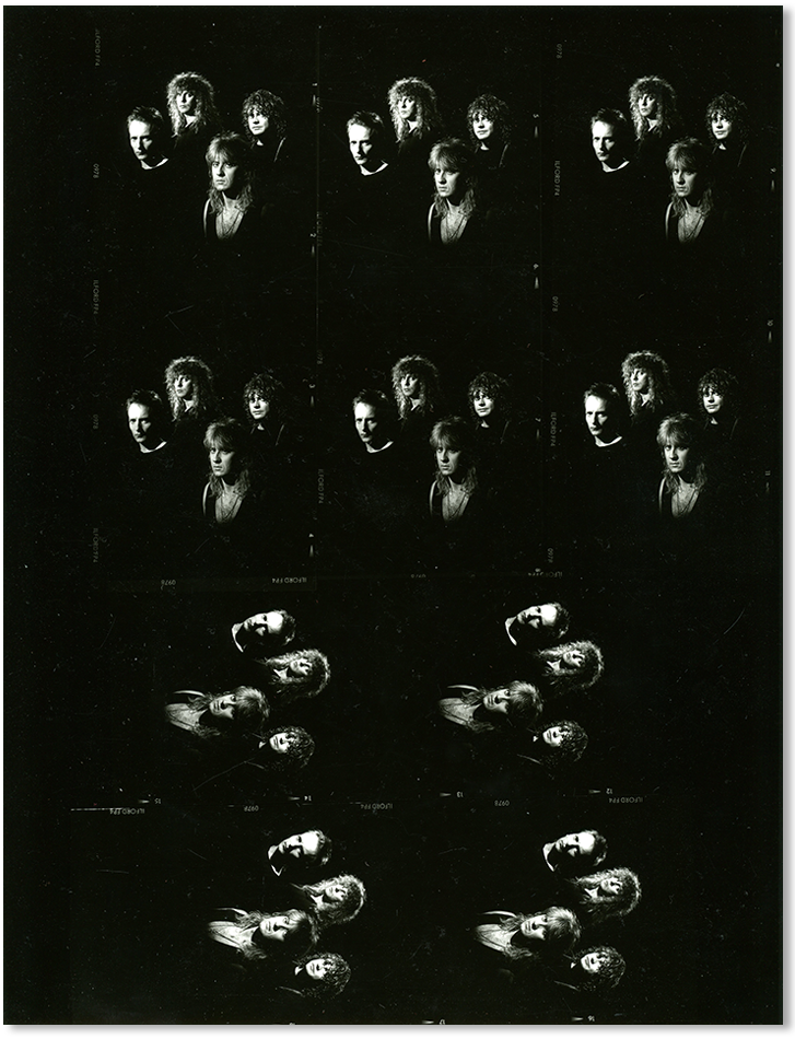 Black and white contact sheet of ten images of Joe Elliott, Phil Collen, Rick Savage, and Rick Allen from 1992 "Let's Get Rocked" video shoot. From the collection of Def Leppard.