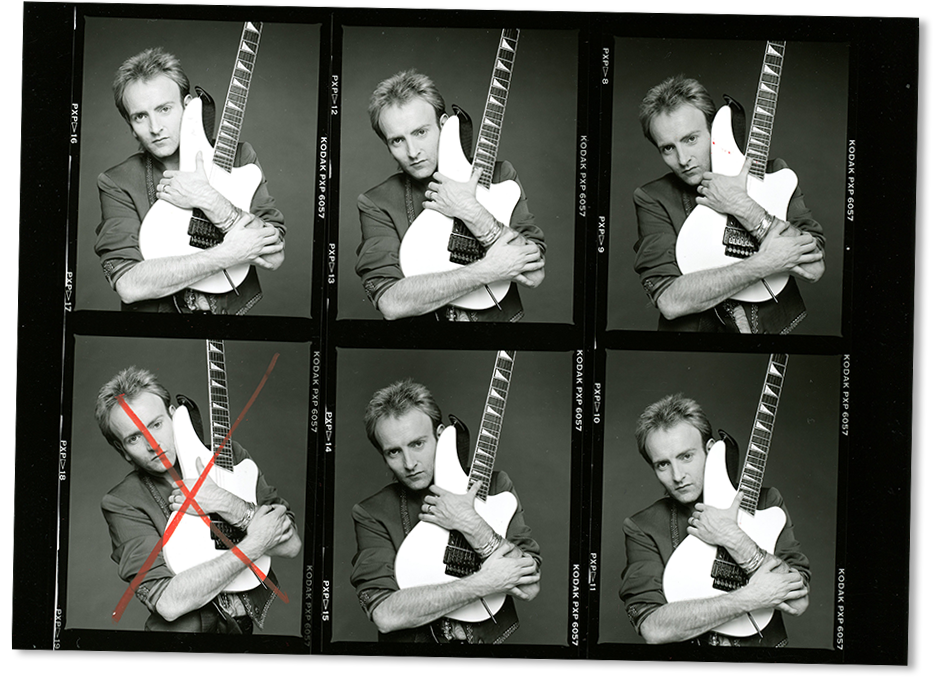 Black and white contact sheet of six images of Phil Collen holding a guitar from 1992. The photographer is unknown. Selection notes are in red. From the collection of Def Leppard.