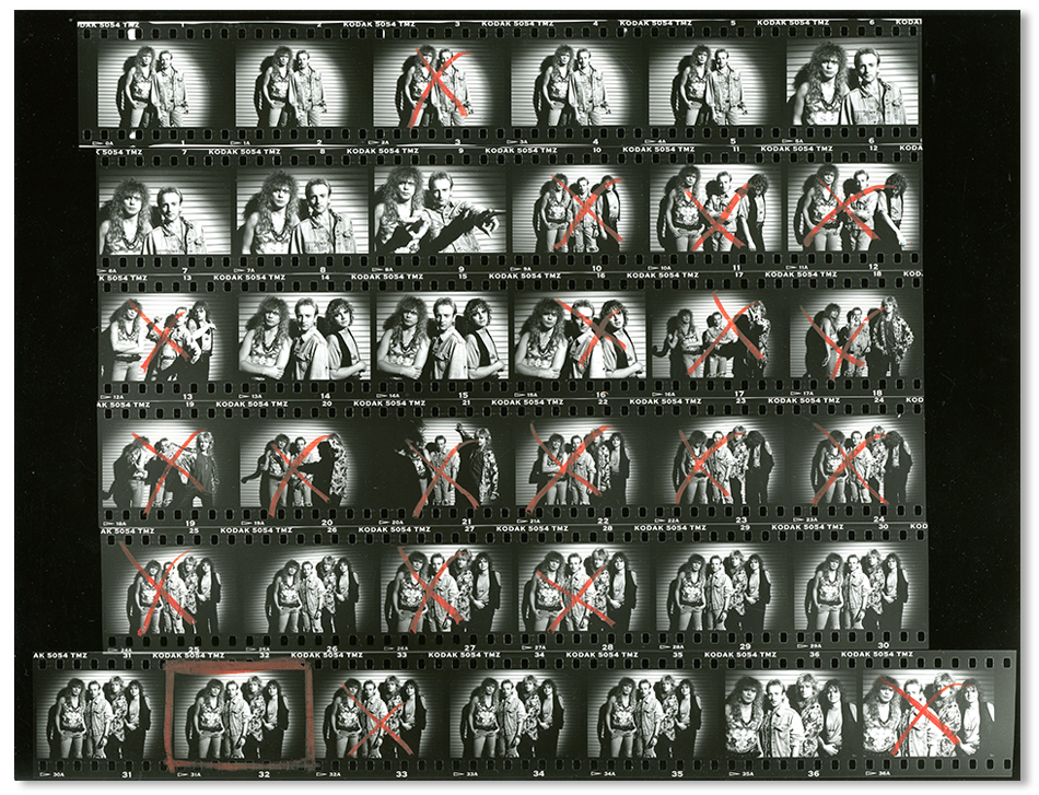 Black and white contact sheet from a possible Rolling Stone shoot. Selection notes are in red. Photographer unknown. From the collection of Def Leppard.