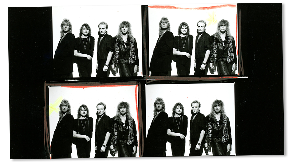 Black and white contact sheet of four images featuring Joe Elliott, Phil Collen, Rick Savage, Vivian Campbell, and Rick Allen. From the collection of Def Leppard.
