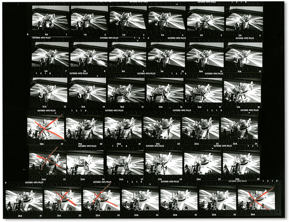 Black and white contact sheet of thirty seven images of band and crew setting up and playing on a stage with a Union Jack design from the "Let's Get Rocked" video shoot. Theses pictures were taken in 1992 Selection notes are in red. From the collection of Def Leppard.