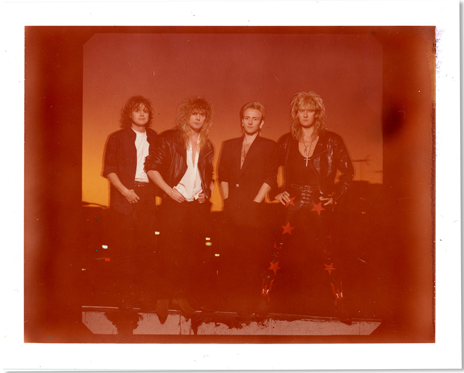 1992 Color photo from the roof at Mates in Los Angeles at the "Let's Get Rocked" video shoot. Color photo of Joe Elliott, Phil Collen, Rick Savage, and Rick Allen. From the collection of Def Leppard.