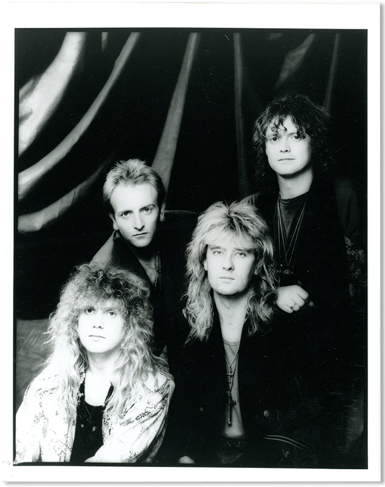 1992 Black and white promotional photo featuring Joe Elliott, Phil Collen, Rick Savage, Vivian Campbell, and Rick Allen. From the collection of Def Leppard.