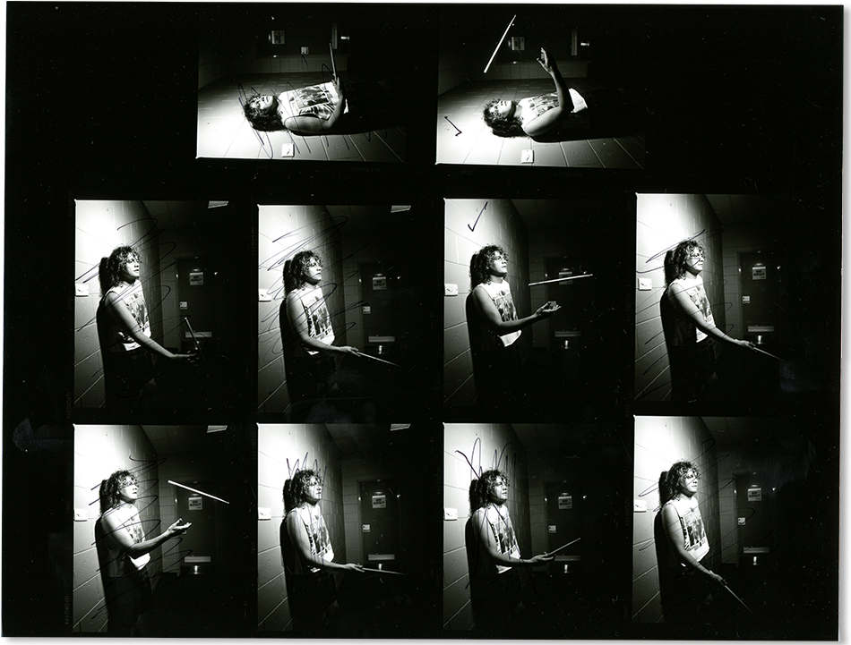 Black and white contact sheet of ten images of Rick Allen tossing a drumstick backstage. These images were shot in 1992. Selection notes are in black. From the collection of Def Leppard.