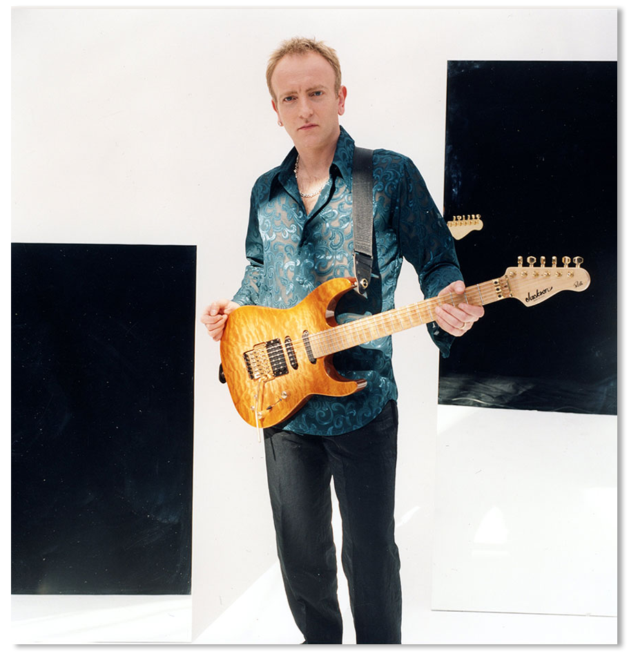 Euphoria album shoot 1999. Color promotional portrait of Vivian Campbell holding a guitar. From the collection of Def Leppard.