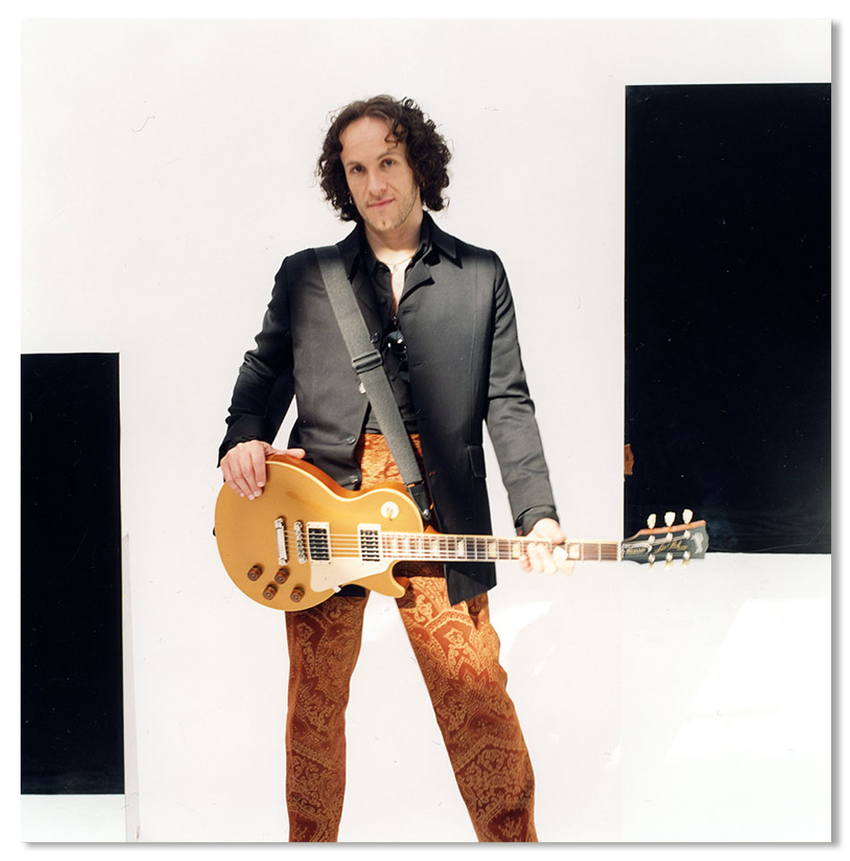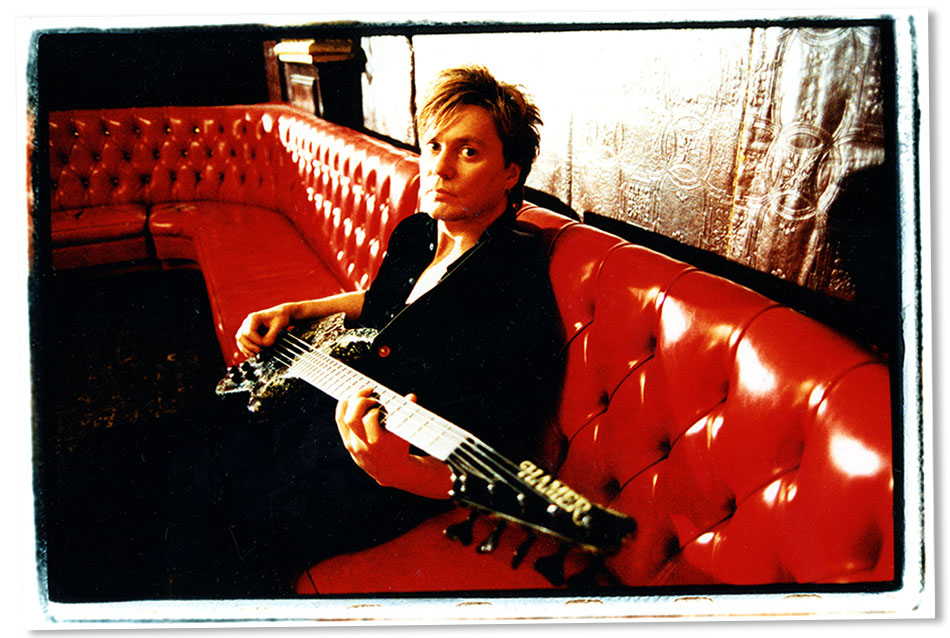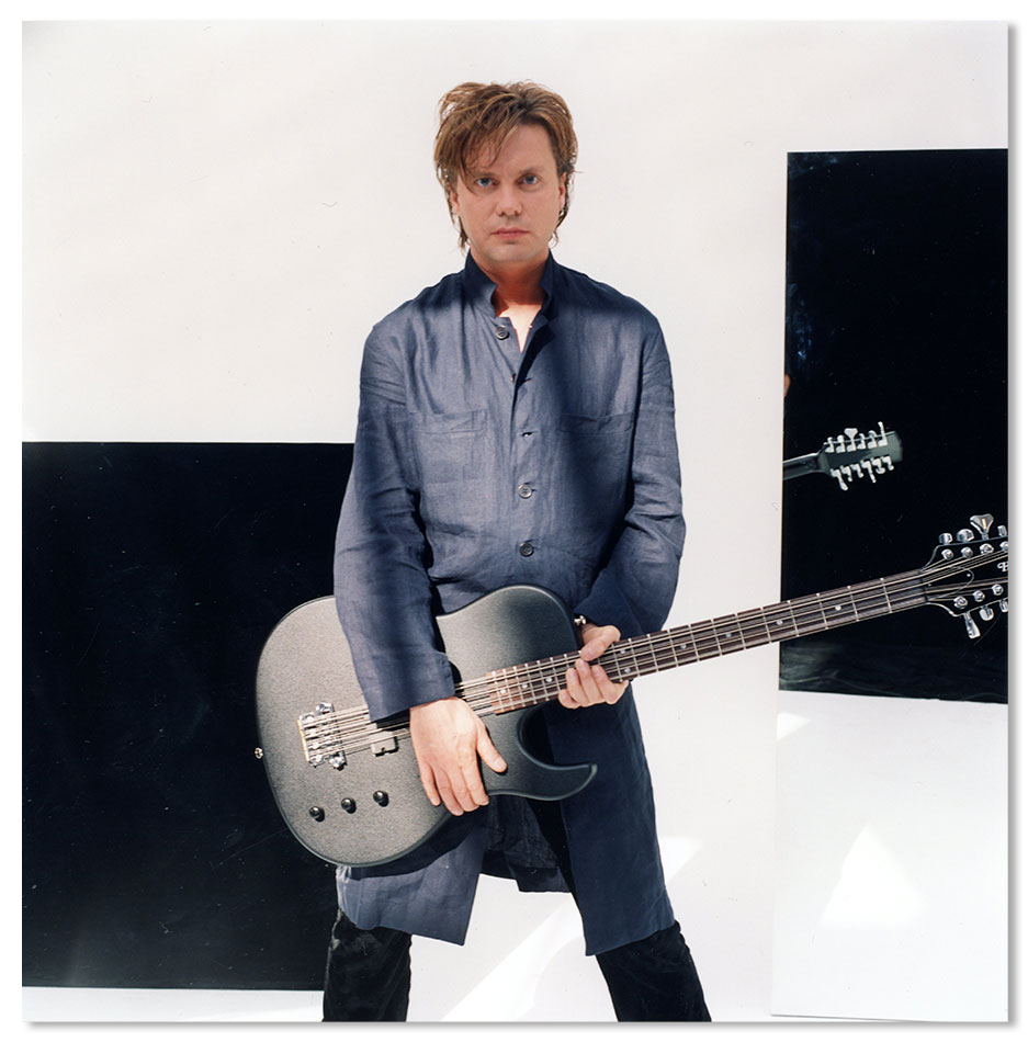 Euphoria album shoot 1999. Color promotional portrait of Phil Collen holding a guitar. From the collection of Def Leppard.