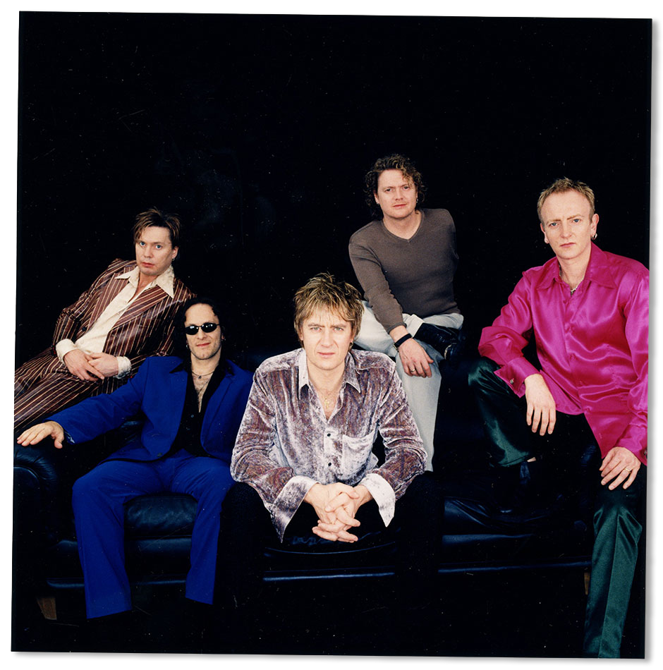Euphoria album shoot 1999. Color promotional photo featuring Joe Elliott, Phil Collen, Rick Savage, Vivian Campbell, and Rick Allen lounging on a couch in front of a black background. From the collection of Def Leppard.