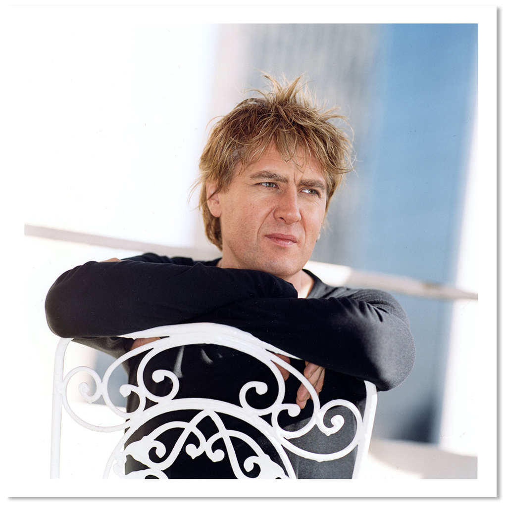 Euphoria album shoot 1999. Color promotional portrait of Joe Elliott on a balcony. From the collection of Def Leppard.