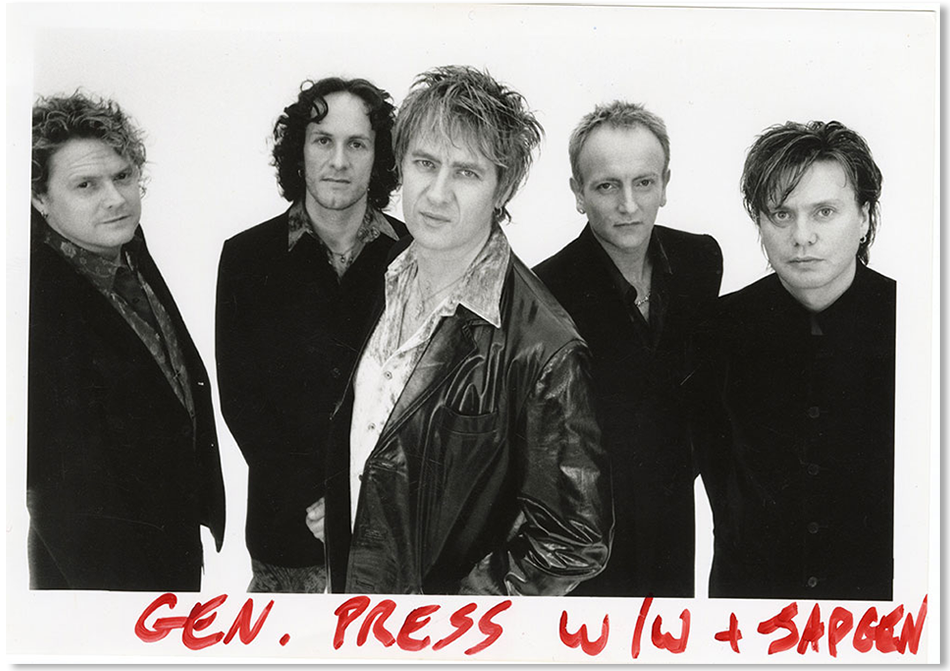 Euphoria album shoot 1999. Black and white promotional photo of Joe Elliott, Rick Allen, Rick Savage, Vivian Campbell, and Phil Collen against a white backdrop. There is a note in red that says "Gen. press w/w + sapgen". From the collection of Def Leppard.