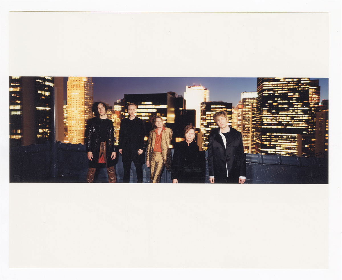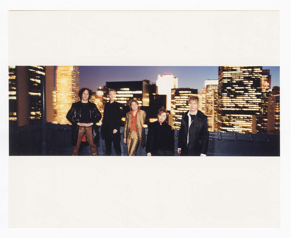 Stunning, 8x10 colour portrait of the band taken during a session for Euphoria album insert artwork, circa 1999. Vivian Campbell, Phil Collen, Rick Allen, Rick Savage, and Joe Elliott stand on a rooftop with the city skyline behind them. A handwritten note on the back reads, "300091 1/2/3 artwork." Housed in Q Prime envelope labeled "Album artwork." From the collection of Def Leppard.