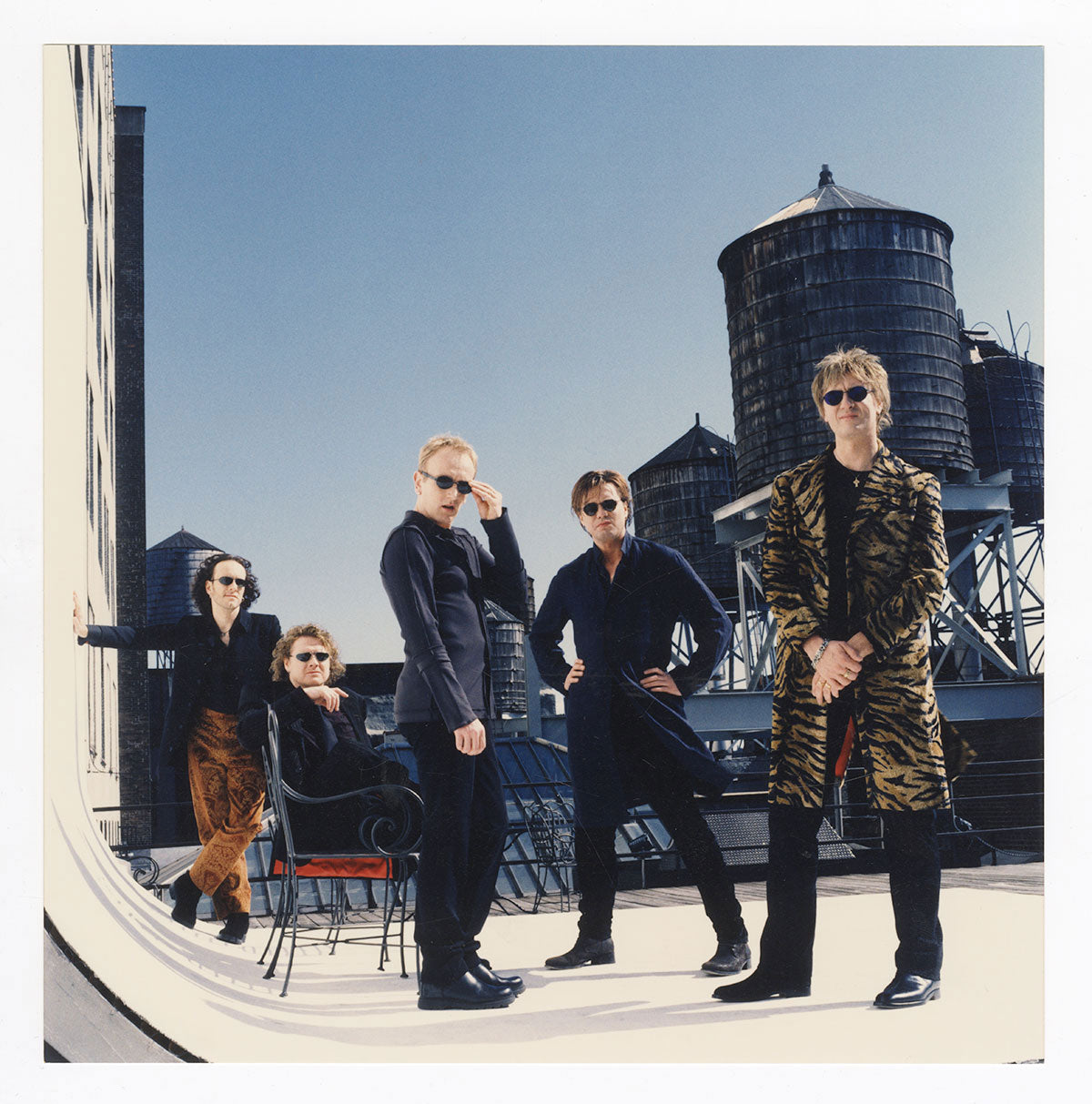 Euphoria album shoot 1999. Color negative of Joe Elliott, Rick Allen, Rick Savage, Vivian Campbell, and Phil Collen lounging on a couch against a black backdrop. From the collection of Def Leppard.