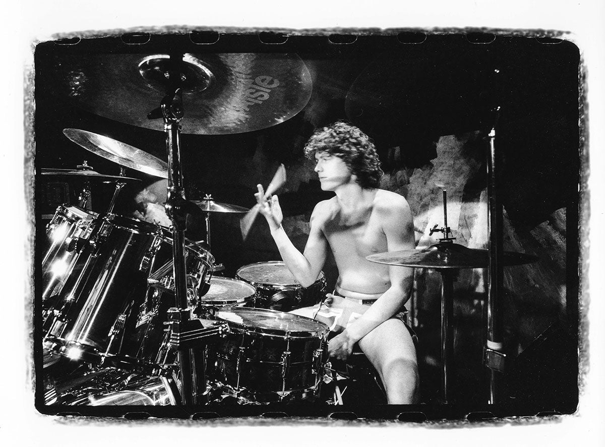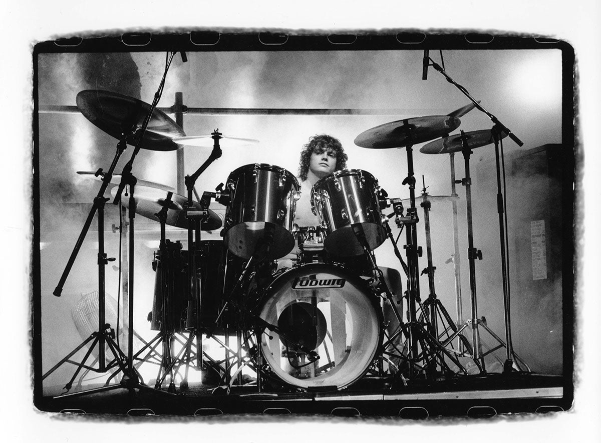 Rick sitting behind an impressive drum kit, wearing a wireless headset mic and ready to rock a Pyromania performance, circa 1983/1984. There's a note behind him, requesting cowbell. From the Collection of Def Leppard.