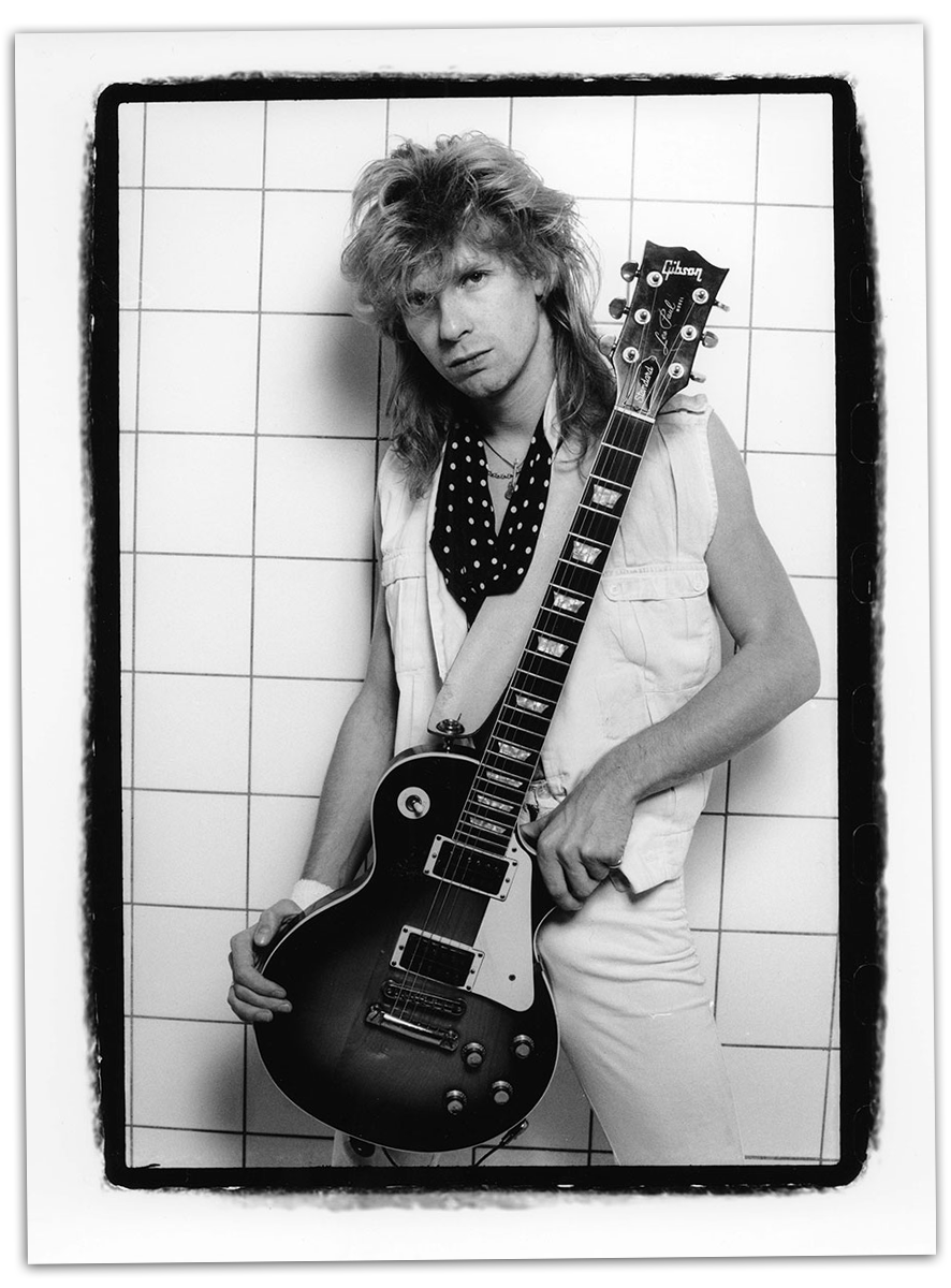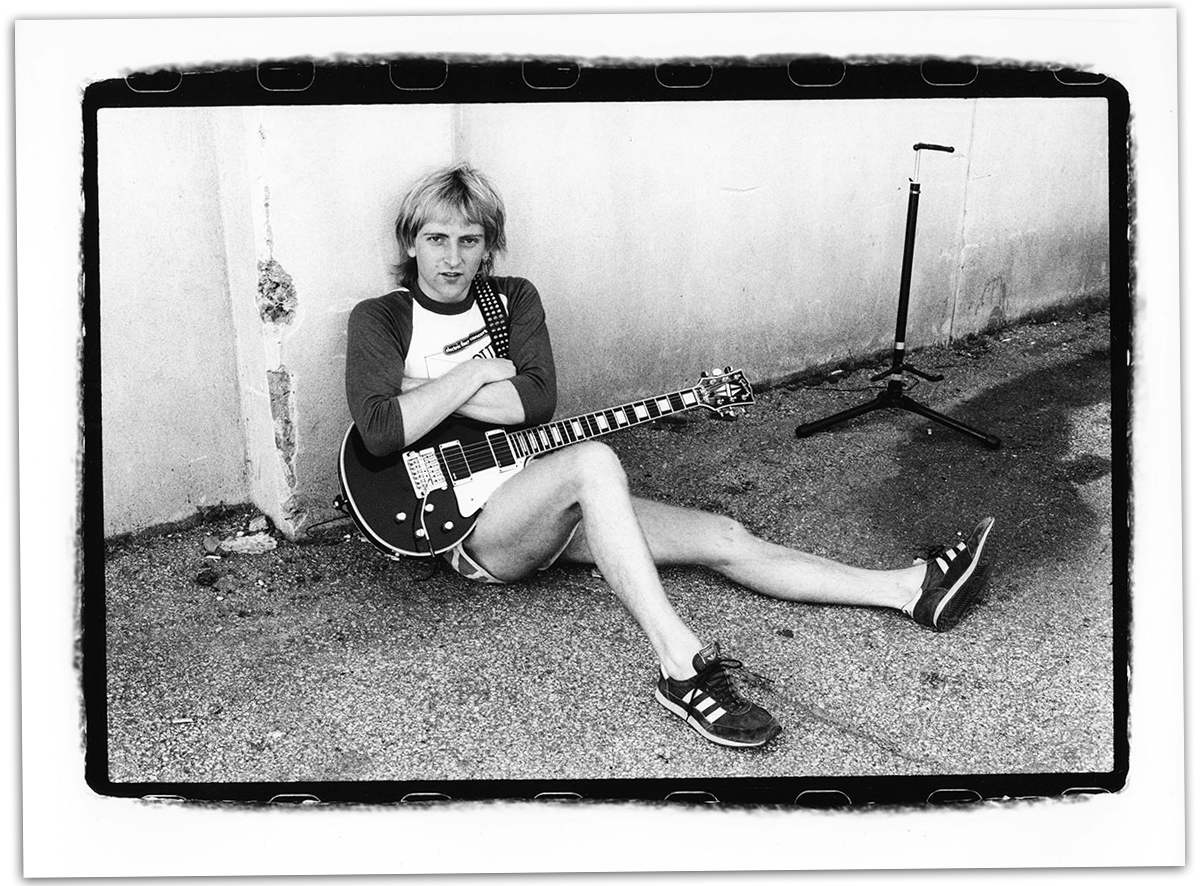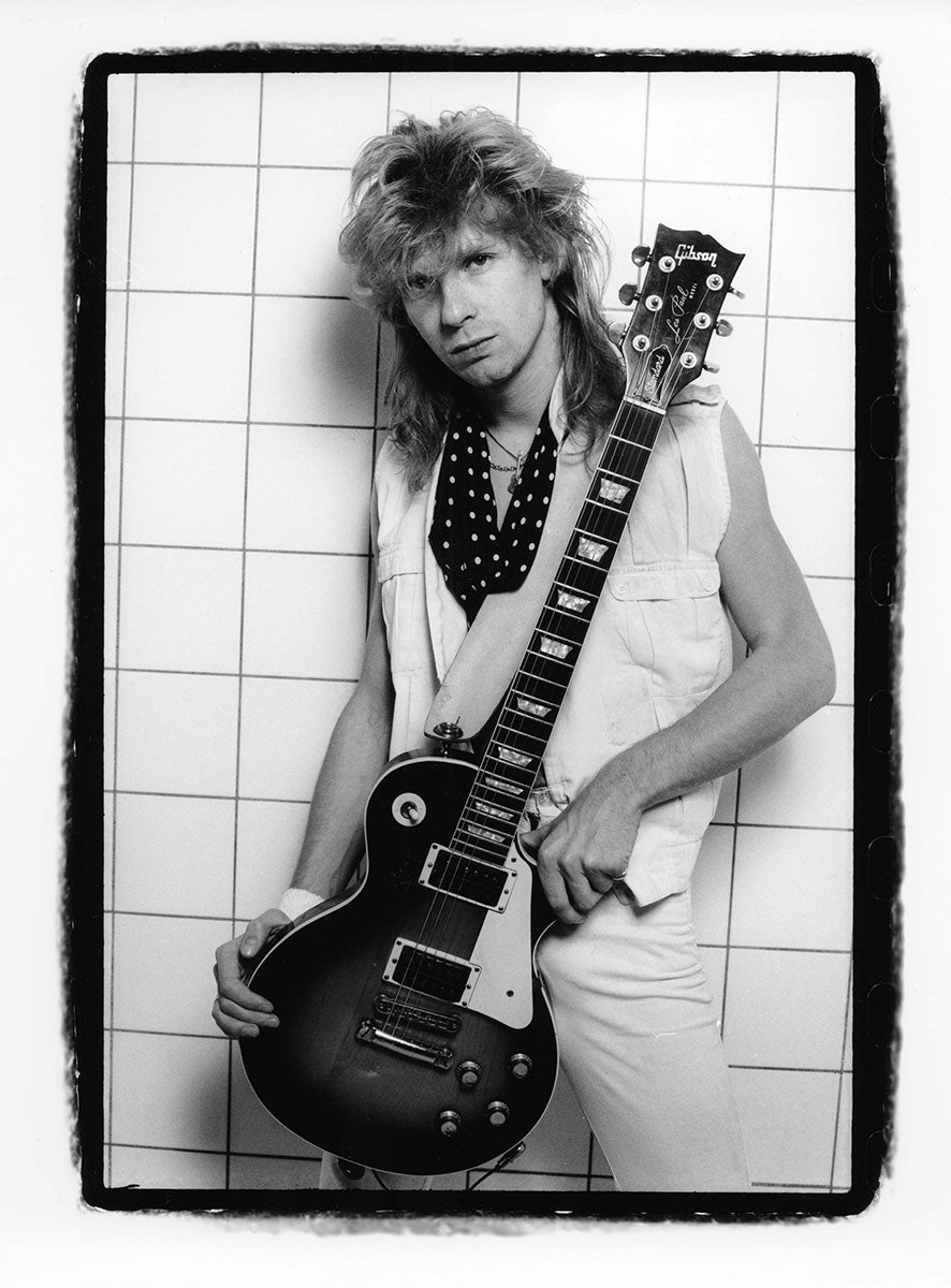 Steve Clark leans against a tiled wall, holding his classic Gibson Les Paul Standard. This photo was snapped offstage during the 1983 Pyromania Tour. From the Collection of Def Leppard.