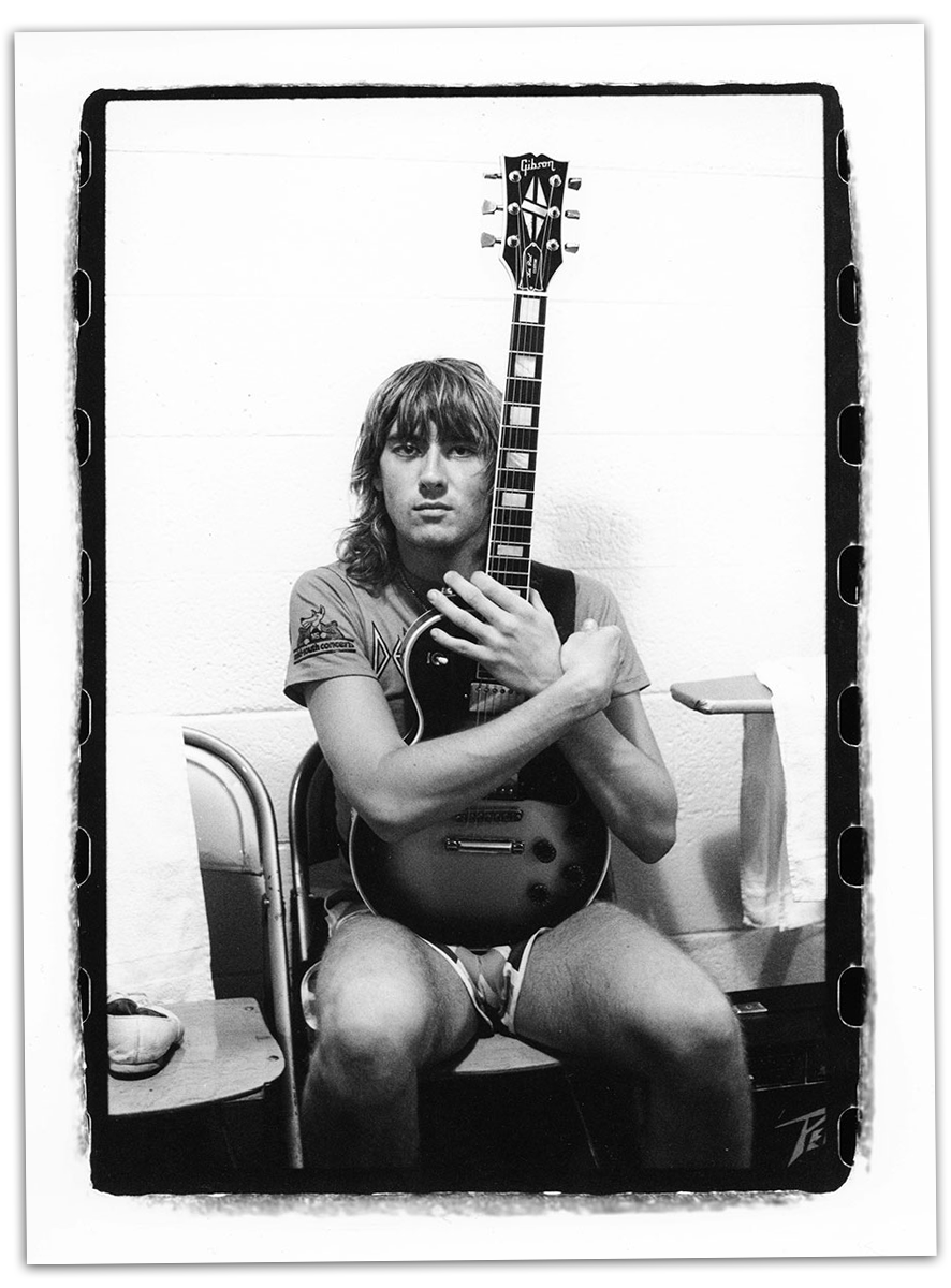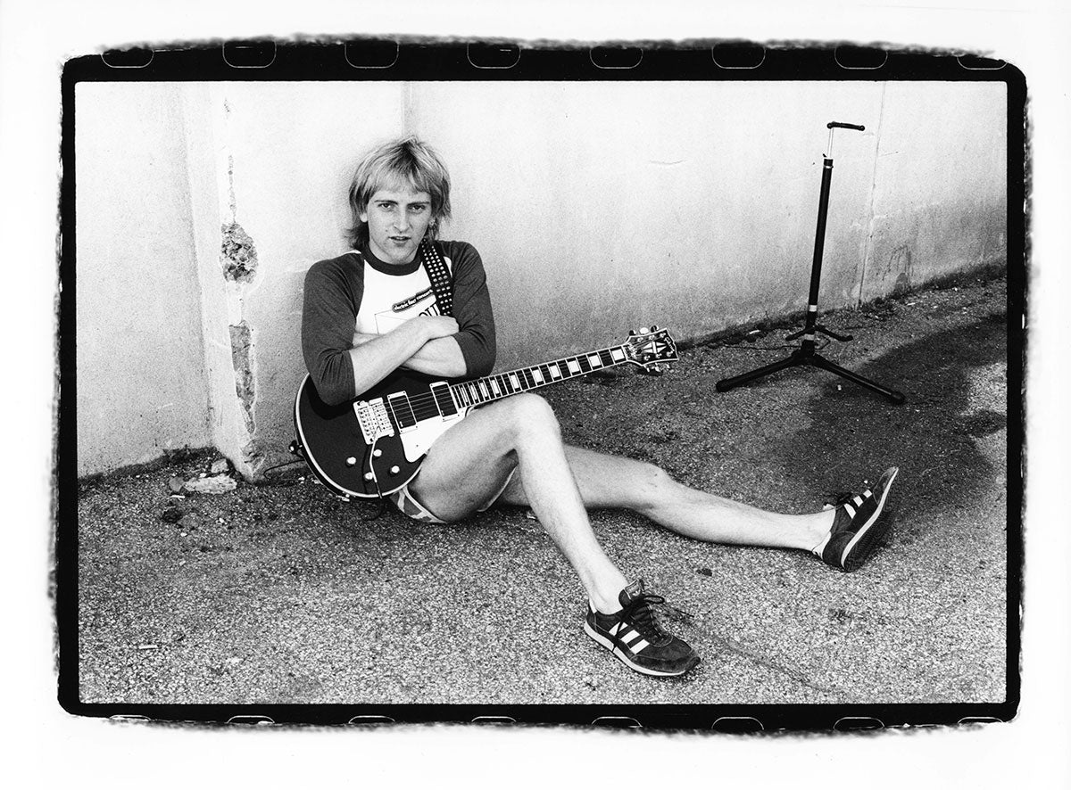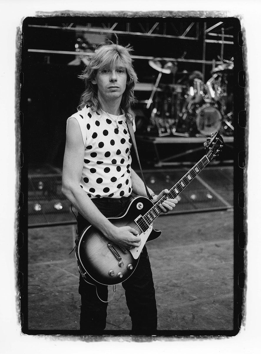 Steve Clark leans against a tiled wall, holding his classic Gibson Les Paul Standard. This photo was snapped offstage during the 1983 Pyromania Tour. From the Collection of Def Leppard.