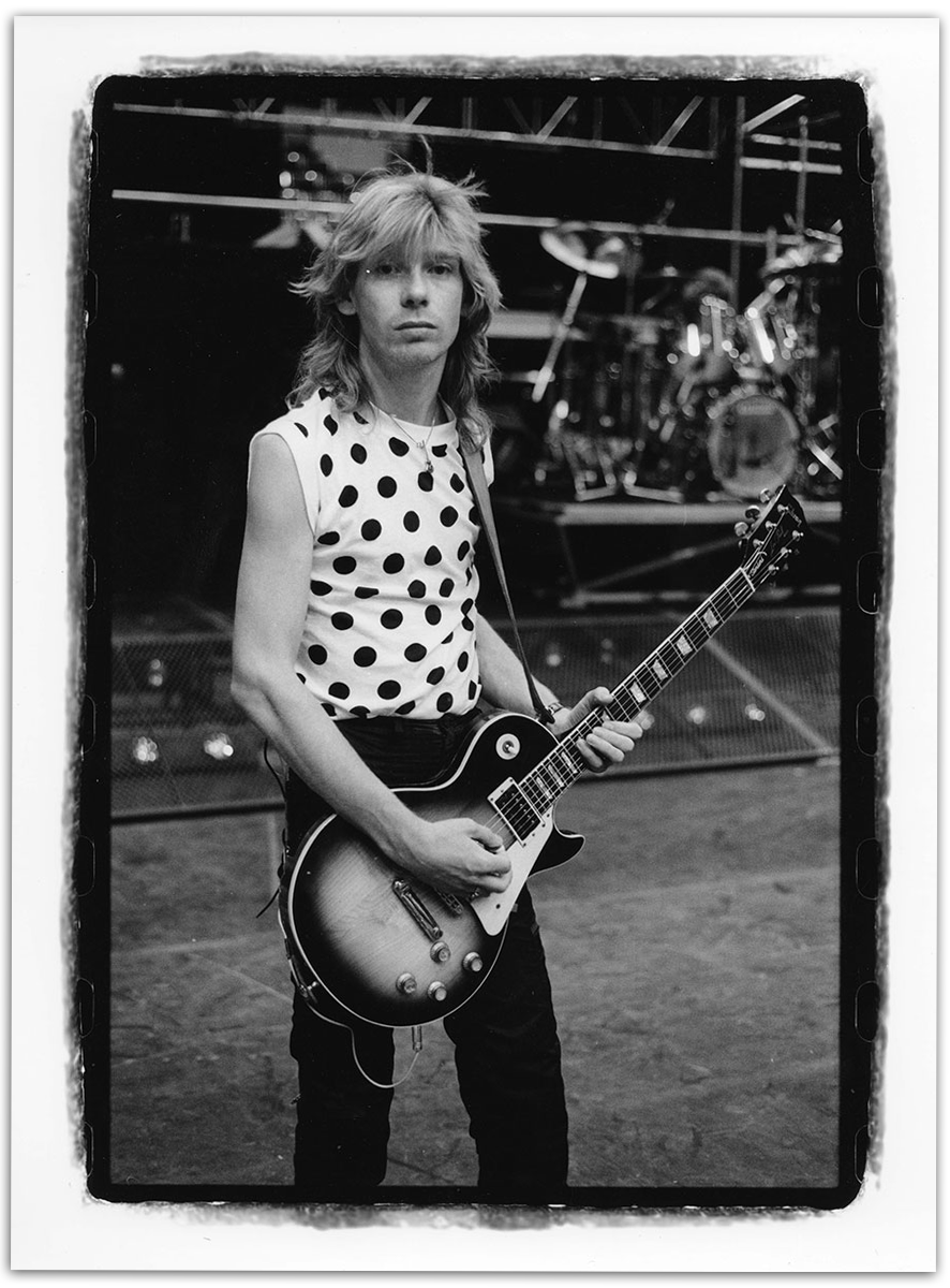 Sav warming up on the Hamer Blitz before a show on the Pyromania tour, circa 1983. From the Collection of Def Leppard.