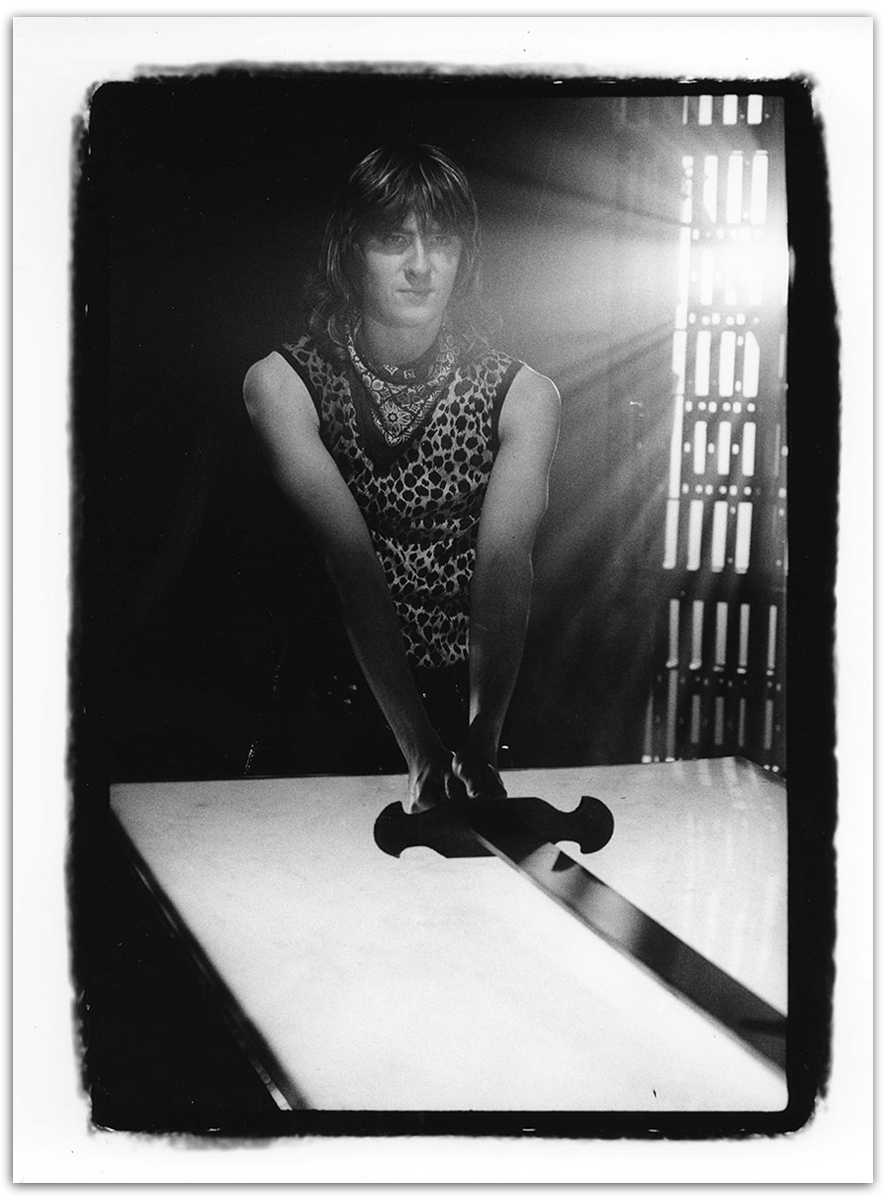 Joe wields his trusty sword on the set of the "Rock Of Ages" video, December 1982. From the Collection of Def Leppard.