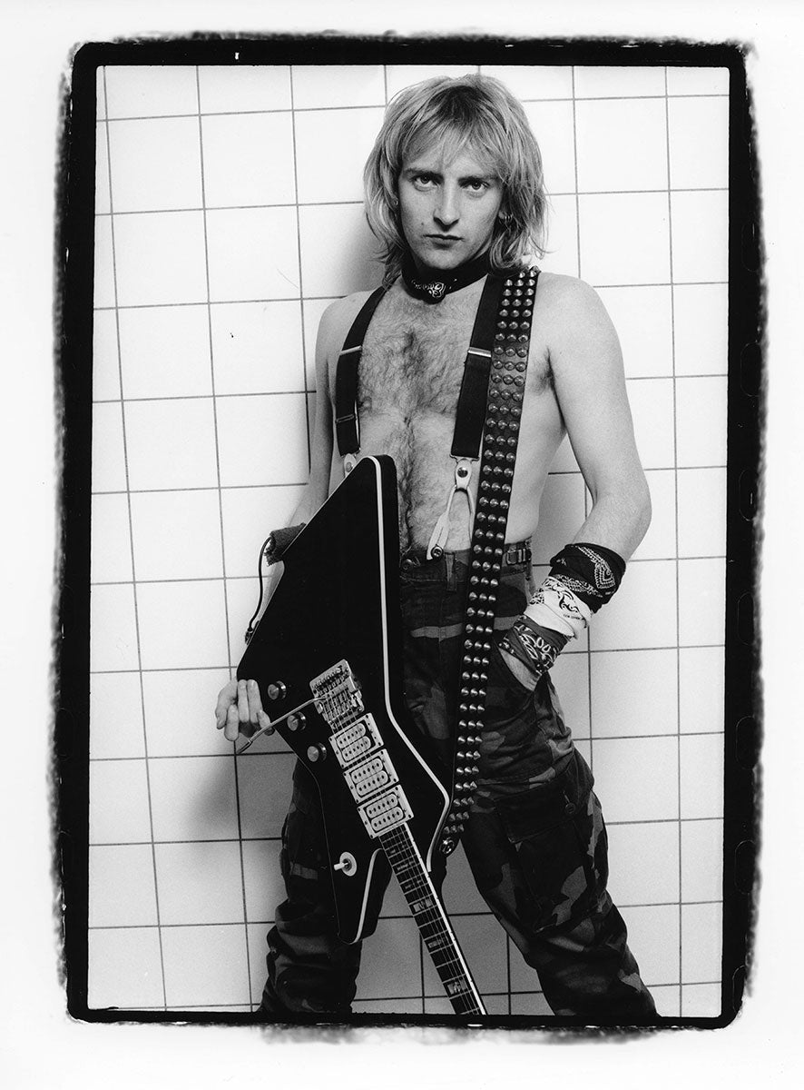 Phil strikes a pose in front of a tiled wall, no doubt preparing to do some damage with his Ibanez Destroyer. This photo was snapped offstage during the 1983 Pyromania Tour. From the Collection of Def Leppard.