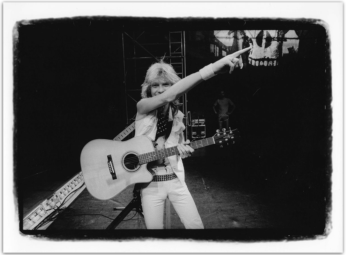 Steve gives an excellent rock 'n roll point whilst preparing for the Alvarez acoustic-electric intro for the Foolin' video, June 1983. Who is the mystery man in the background? From the Collection of Def Leppard.