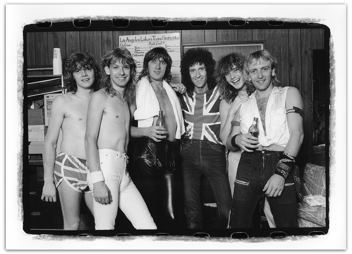 Post-show Pyromania elation backstage at the LA Forum, September 1983. Queen's Brian May was a special guest that evening and played along for the encore "Travelin' Band." It's always a good day when one of your rock heroes asks to jam. From the Collection of Def Leppard.