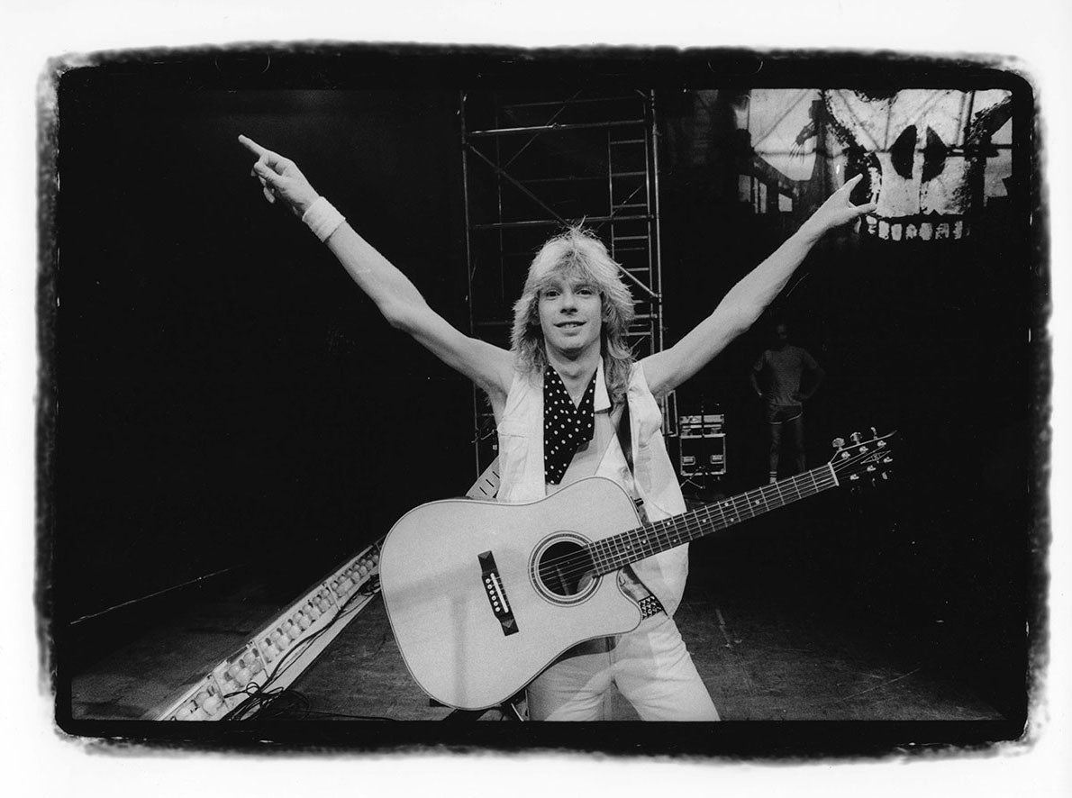 A shining Rick is all smiles on the Rock of Ages video set, December 1982. The video was shot on Phil's birthday and was directed by legendary video director, David Mallet. From the Collection of Def Leppard.