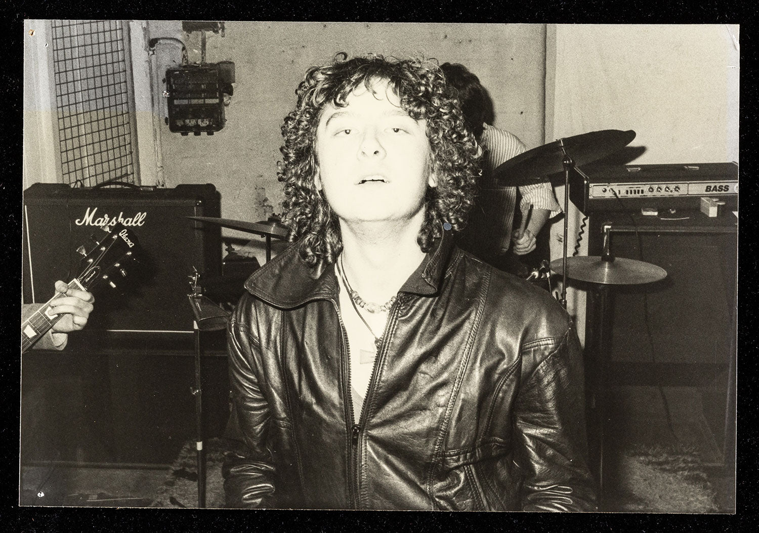 Joe at a rehearsal at the Spoon Factory, Sheffield, England, 1978. Steve is playing to Joe's right, and Frank Noon is playing drums behind. Photo: John Wood. From the Collection of Joe Elliott.