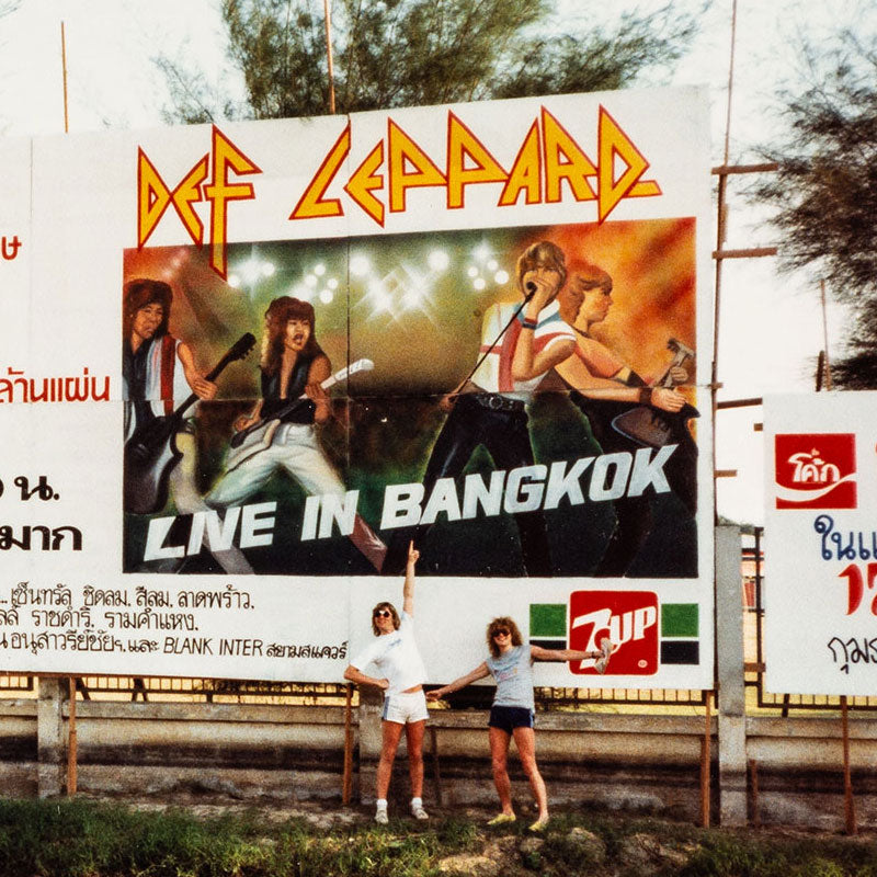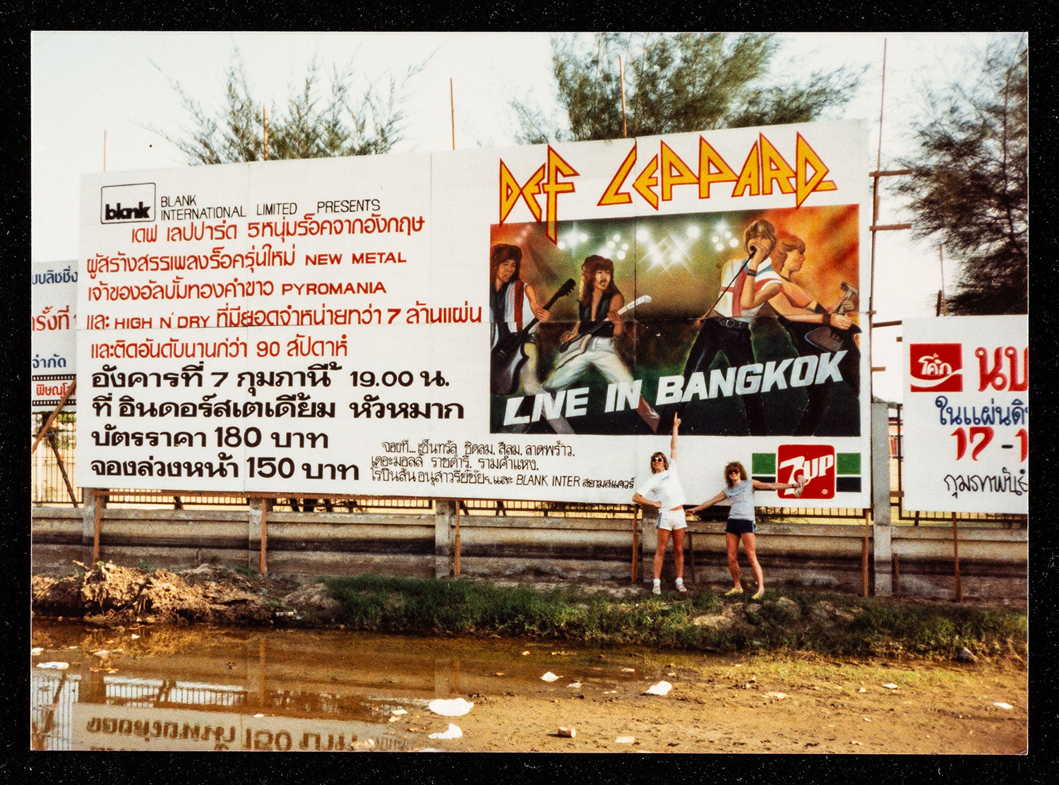 Joe and Sav proudly stand in front of a Def Leppard billboard in Bangkok, Thailand, February 1984. The Bangkok gig at the Hua Mark Indoor Stadium was the last show of the Pyromania Tour. From the Collection of Joe Elliott.