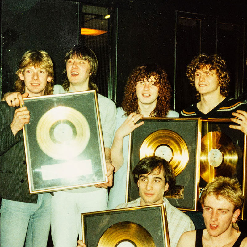 Steve, Joe, Sav, Rick and Phil hold gold RIAA awards for High 'n' Dry, December 1982. Band manager Peter Mensch is kneeling to Phil's right. From the Collection of Joe Elliott.