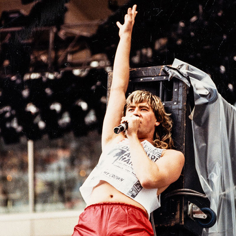 Joe performs during the band's triumphant Monsters of Rock performance at Castle Donington, 16 August 1986. Photo: Ross Halfin. From the Collection of Joe Elliott.