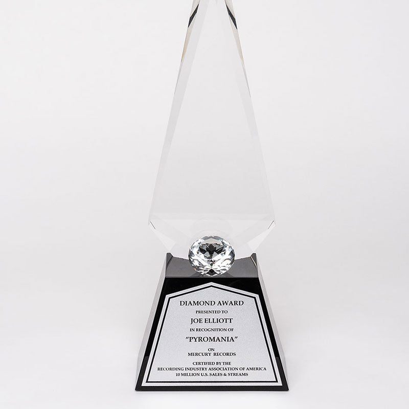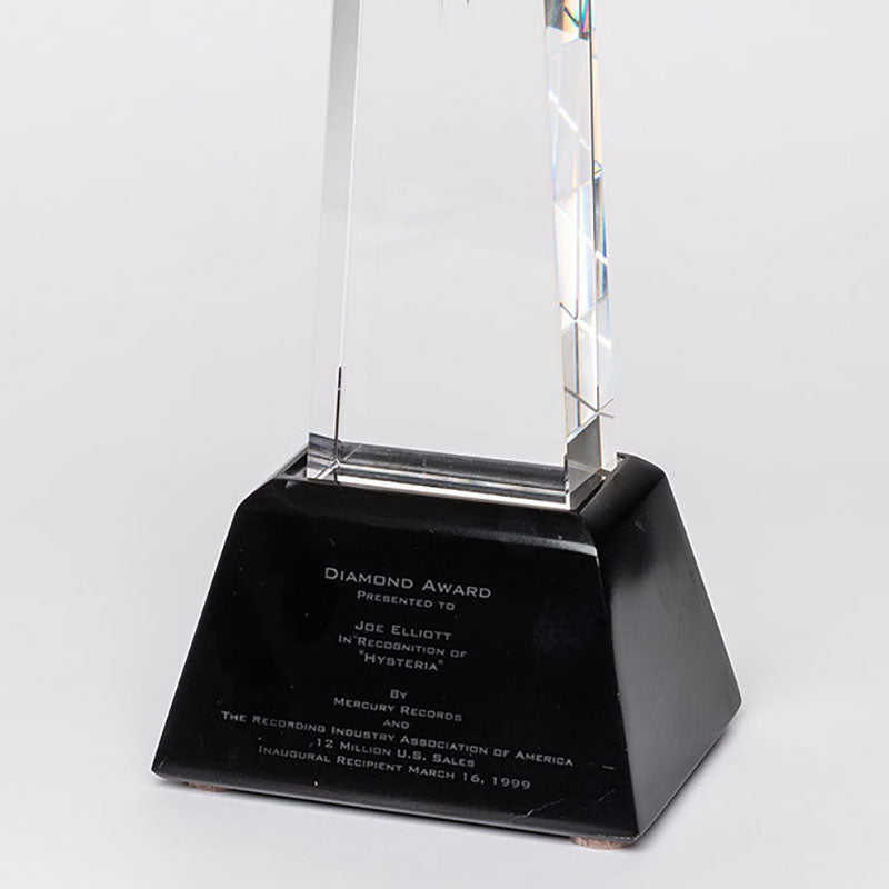 RIAA Diamond Award presented to Joe Elliott in March 1999 (the year the Diamond Award was created), to commemorate Hysteria reaching ten million albums sold in the US. From the Collection of Joe Elliott.