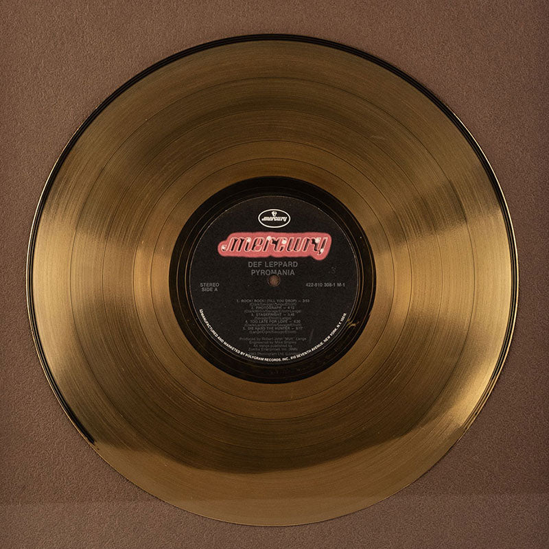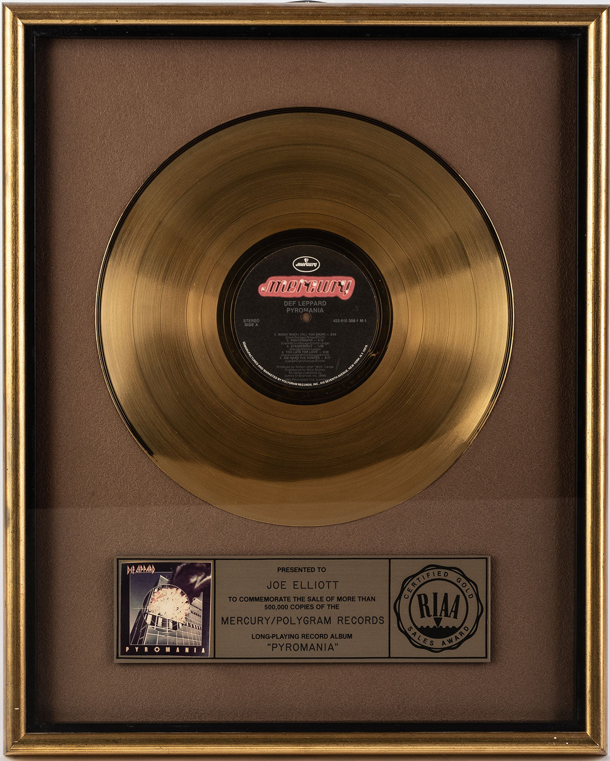 RIAA Gold record presented to Joe Elliott for Pyromania, March 1983. From the Collection of Joe Elliott.