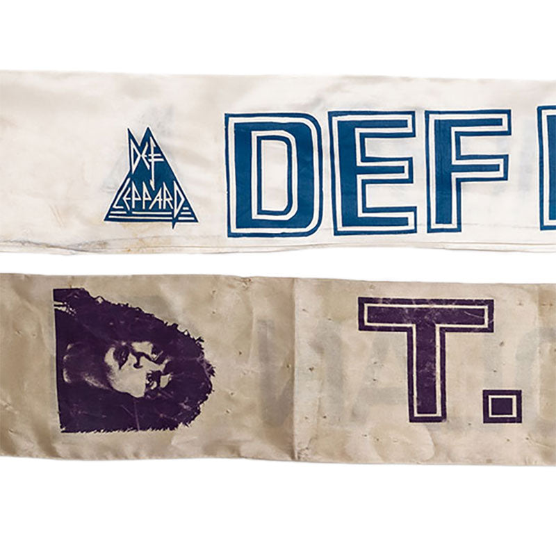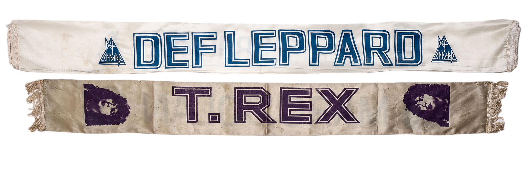 23 October 1971, Joe Elliott was on the steps of Sheffield City Hall, preparing to see his very first concert, T. Rex. On his way in, he stopped to purchase this bootleg T. Rex scarf. Nine years later, on those same Sheffield City Hall steps before Def Leppard's first performance at the venue, Joe spotted an On Through The Night bootleg scarf and bought it. From the Collection of Joe Elliott.