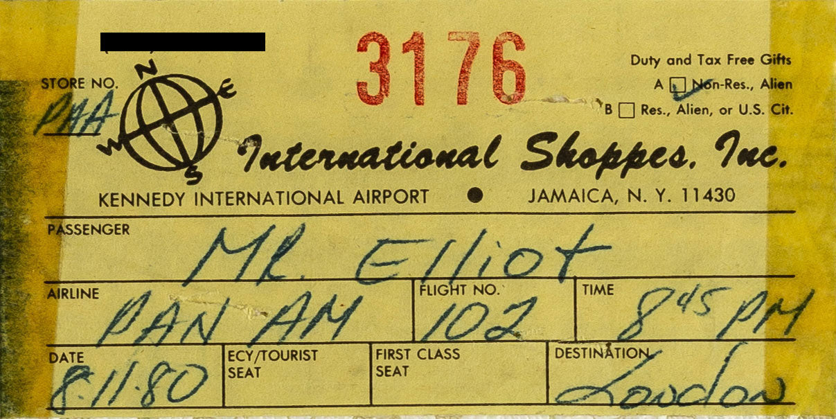 Joe's duty-free shop ticket from International Shoppes, Inc., Kennedy Airport, New York, 11 August 1980. Def Leppard was en route back to London after the band’s first tour to the United States. From the Collection of Joe Elliott.