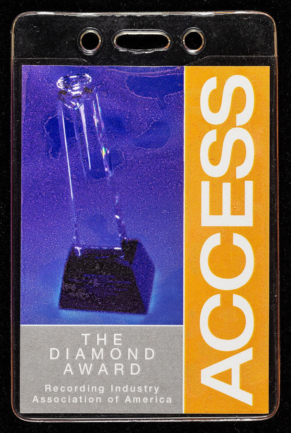 Joe's personal all-access laminate for the RIAA Diamond Award ceremony, held at the Roseland Ballroom, New York, 16 March 1999. From the Collection of Joe Elliott.