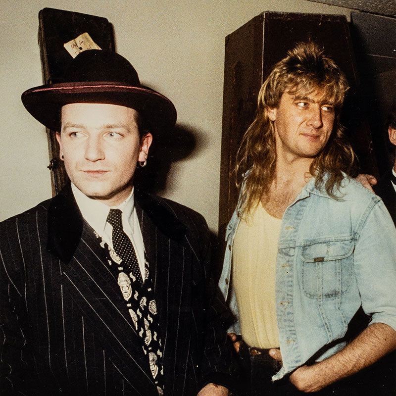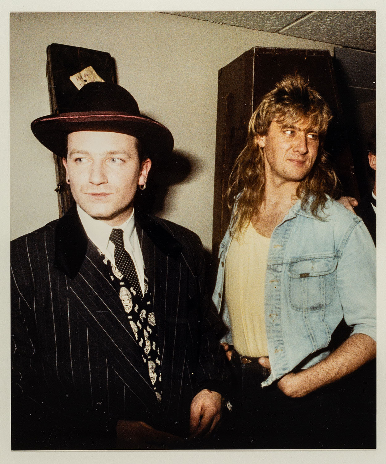 Joe with friend Bono of U2, circa 1990. Bono was responsible for Joe meeting one of his musical heroes, David Bowie, at a barbecue. Joe recalls that he left the party with Bowie and Bono to sing "Happy Birthday" to the Edge at a nearby restaurant. From the Collection of Joe Elliott.