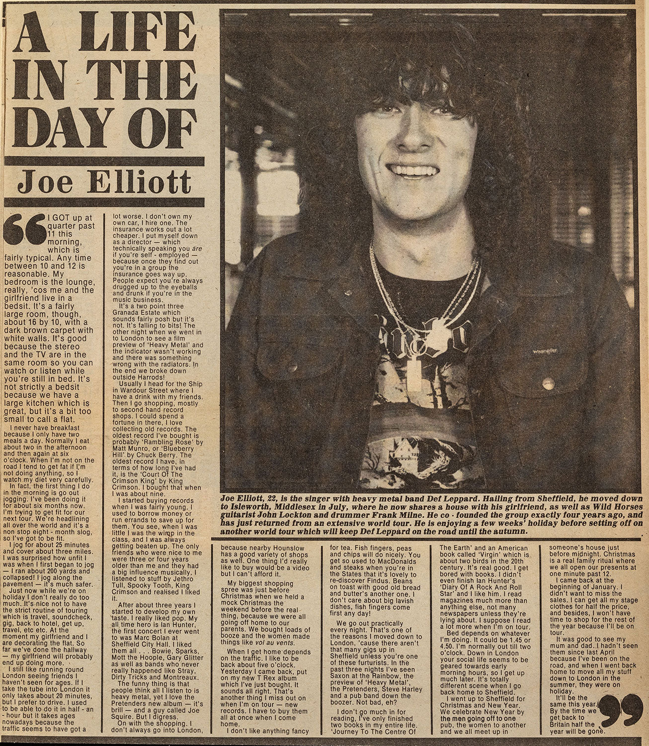 Newspaper clipping containing a feature on Joe in 1981. Joe describes his average day, living in the town of Isleworth in West London, during the short period between the On Through The Night Tour and the High 'n' Dry Tour. From the Collection of Joe Elliott.