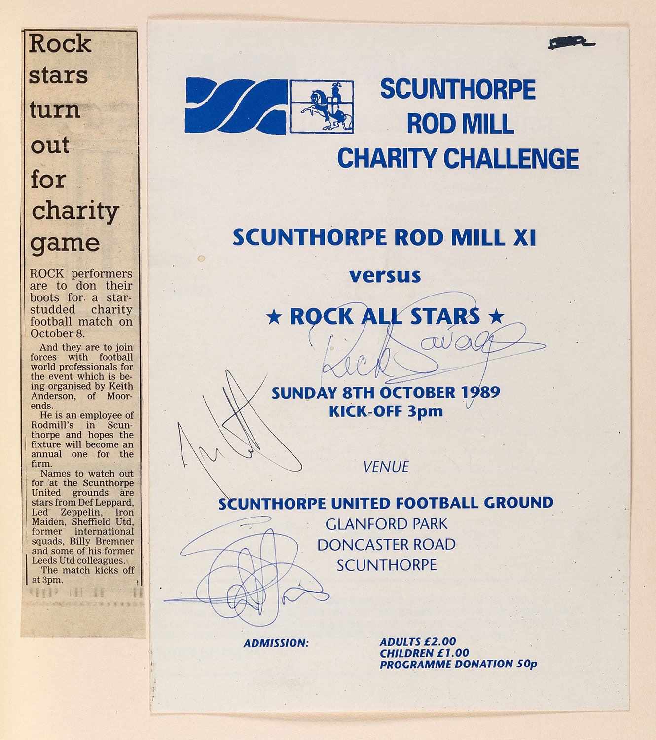 Program from the Scunthorpe Rod Mill Charity Challenge Rock All Stars soccer match signed by Joe, Sav, and Steve Harris of Iron Maiden, 8 October 1989, with accompanying newspaper clipping about the event. Joe and Sav played alongside Harris and Led Zeppelin's Robert Plant. From the Collection of Joe Elliott.