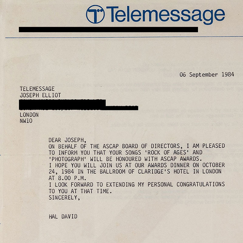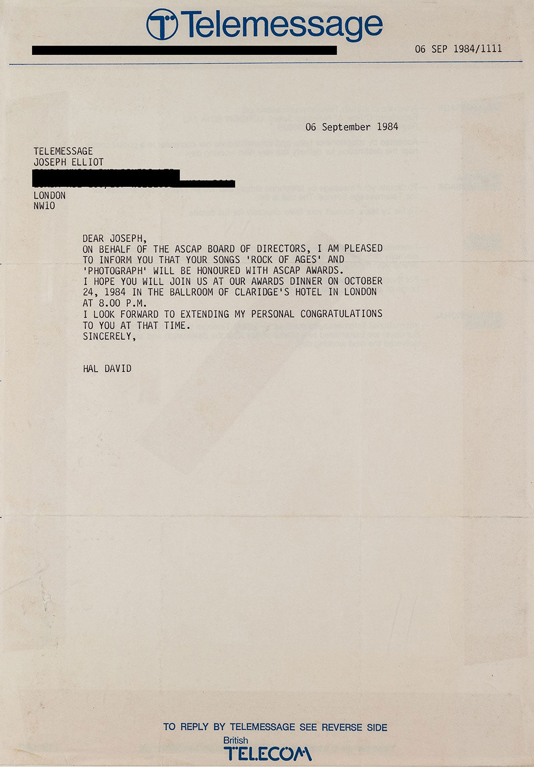 Telemessage correspondence dated 6 September 1984, from Hal David of ASCAP, notifying Joe that "Rock Of Ages" and "Photograph" would both be honoured with ASCAP awards. The ceremony was held 24 October 1984, at the Claridge Hotel, London. From the Collection of Joe Elliott.