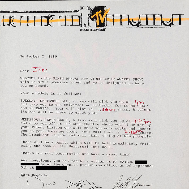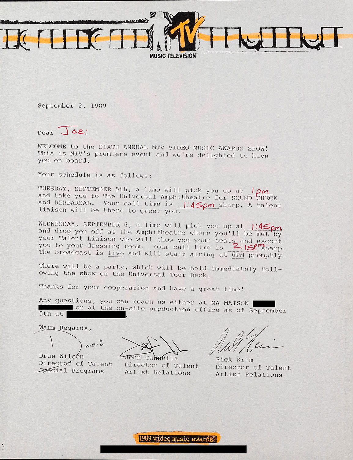 MTV Video Music Awards correspondence, dated 2 September 1989, detailing Joe's schedule for sound check and show day. The ceremony was held at the Universal Amphitheatre, Los Angeles, California, 6 September 1989. Def Leppard performed "Tear It Down". The show marked Steve Clark's last appearance on stage. From the Collection of Joe Elliott.
