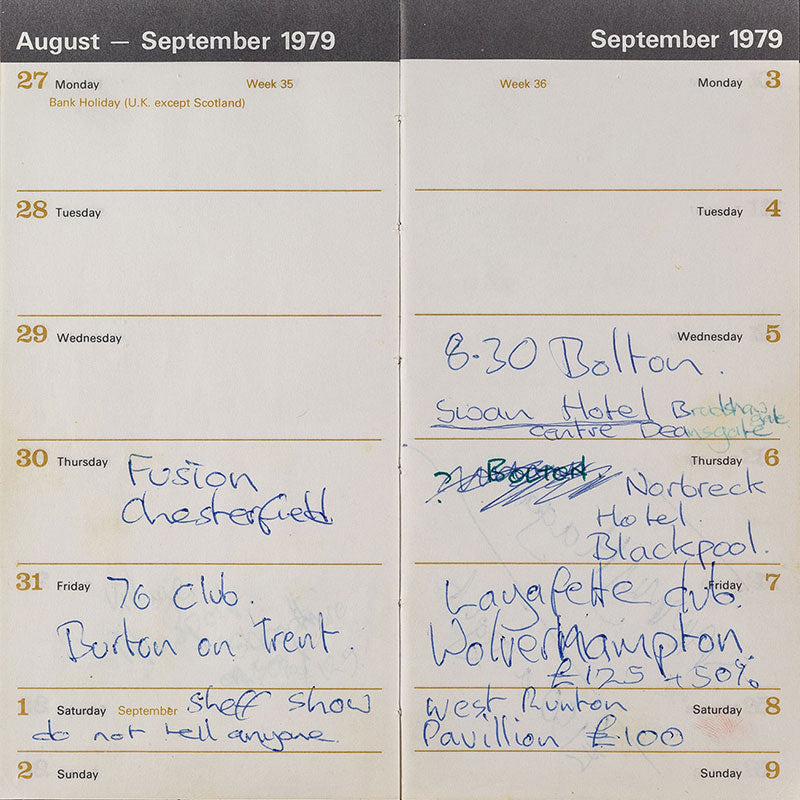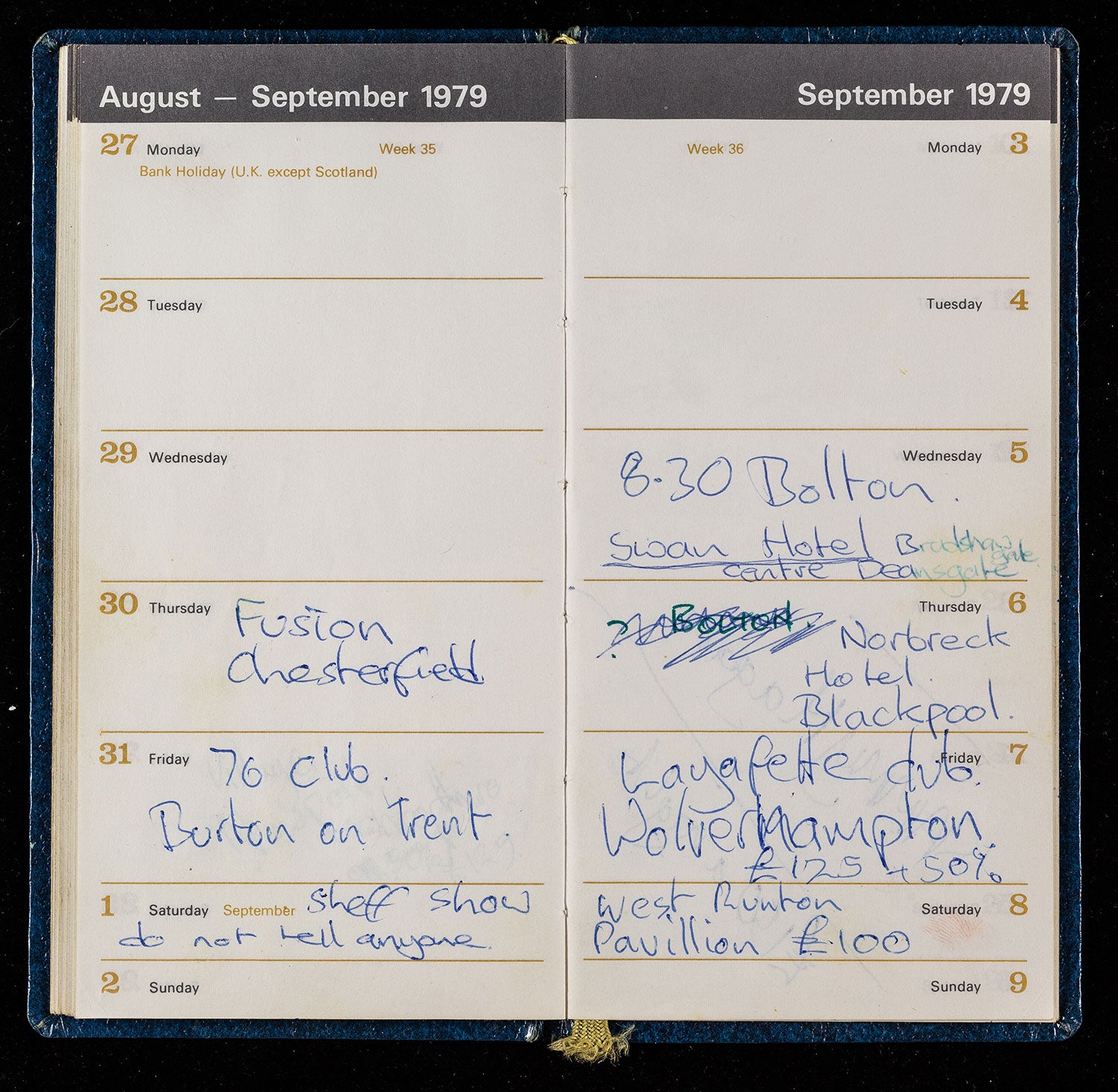 This page from Joe's personal diary lists his schedule for 27 August through 9 September 1979. Managers Peter Mensch and Cliff Burnstein saw Def Leppard for the first time at the Club Lafayette gig in Wolverhampton and soon signed the band as their first client. From the Collection of Joe Elliott.