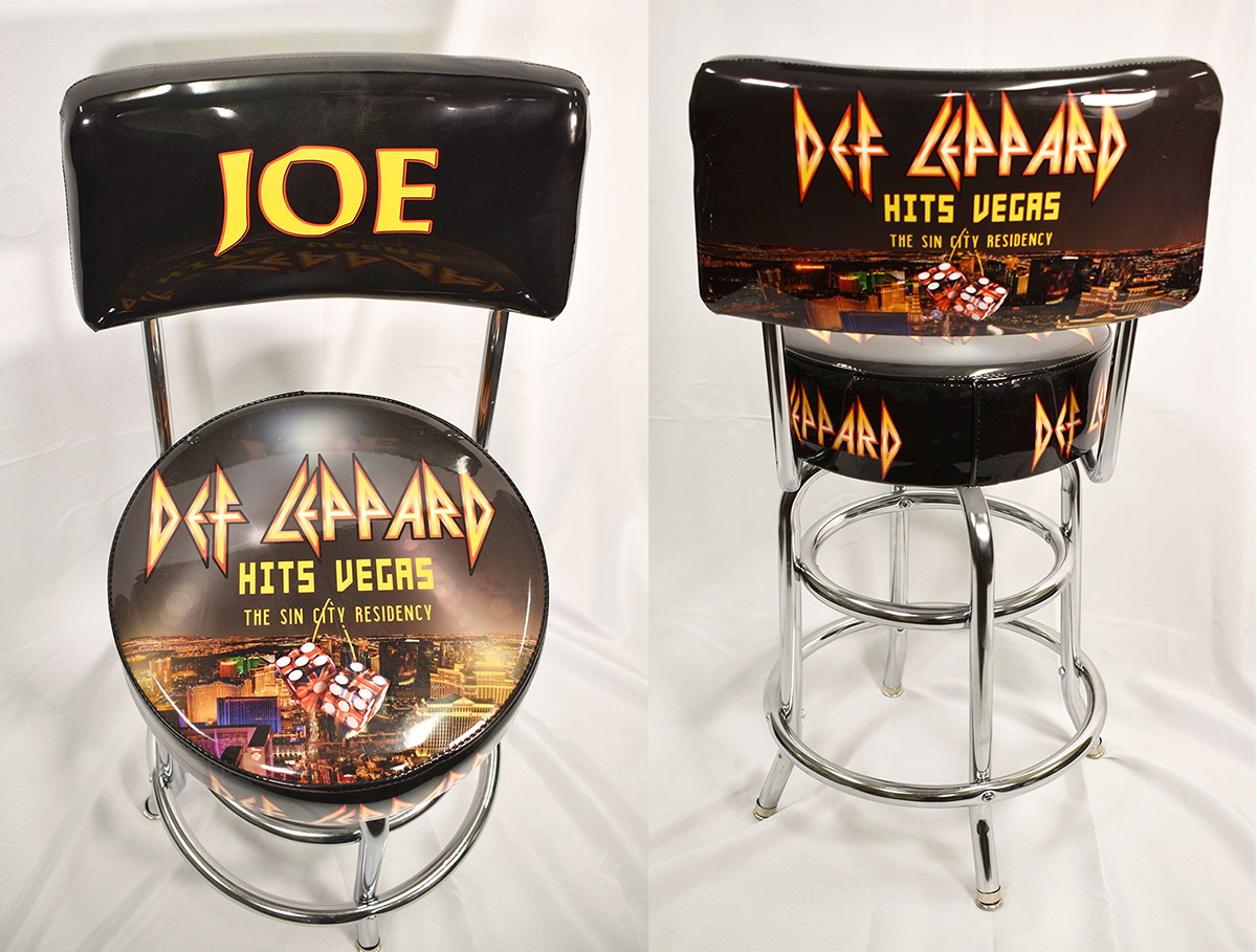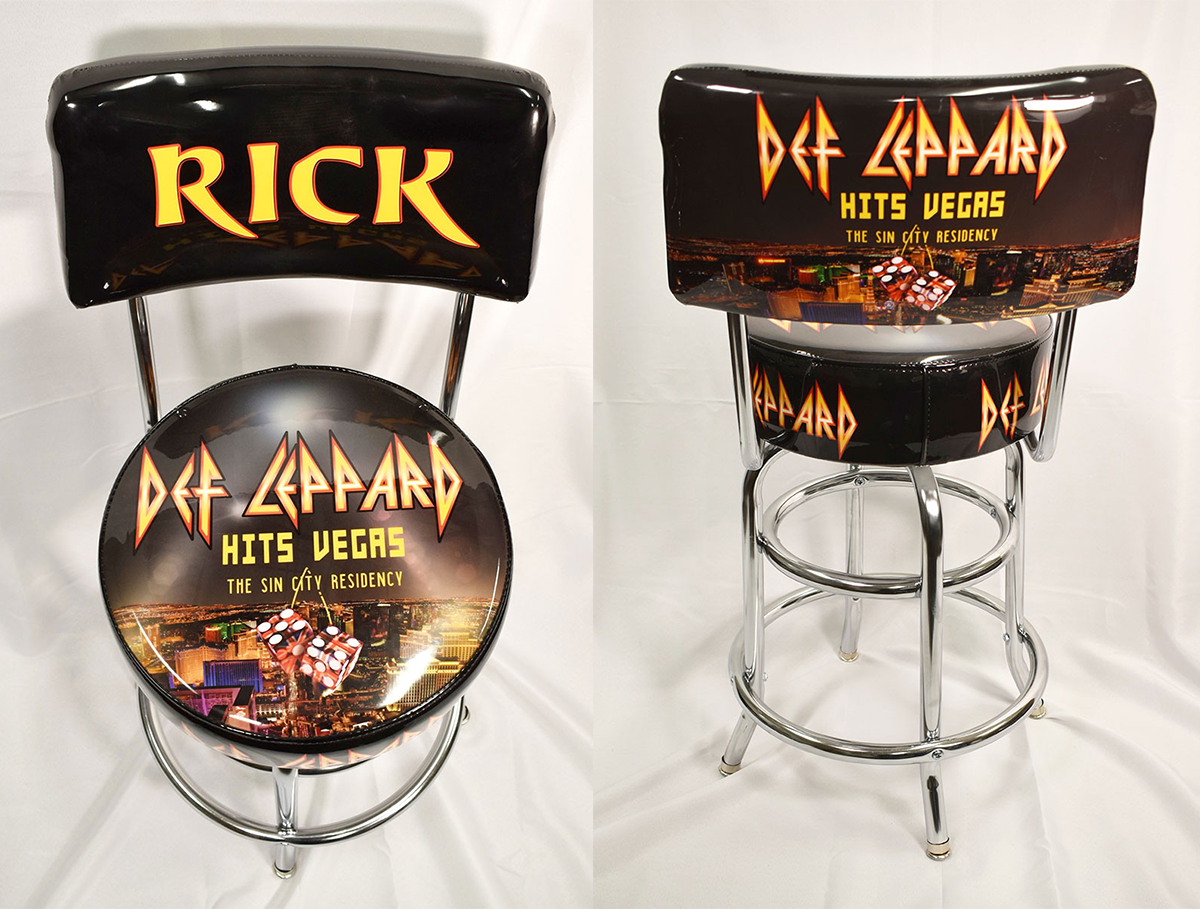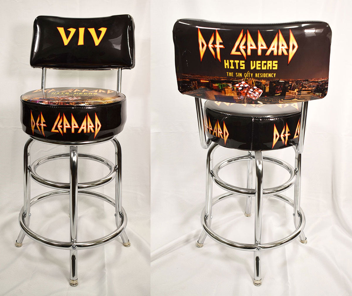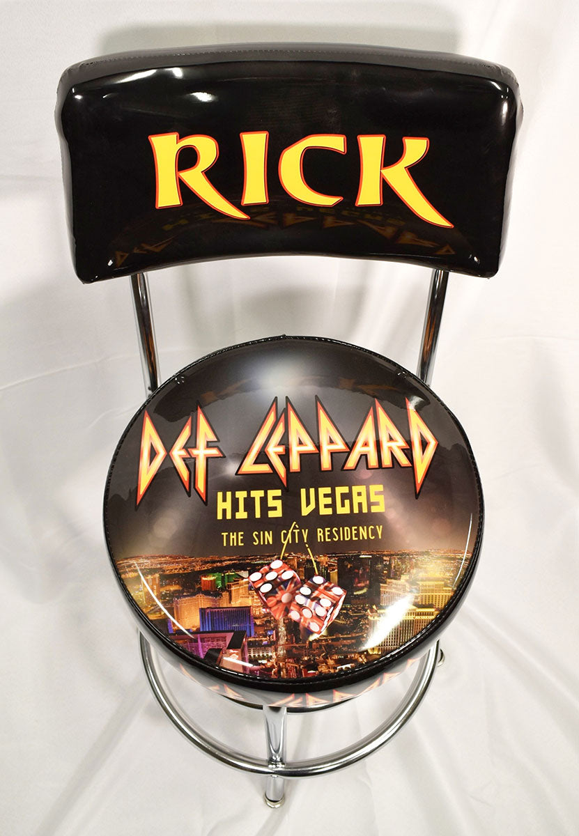 Rick Allen's very own personalized Def Leppard seat back bar stool with chrome legs. This bar stool was used on-stage during the Def Leppard Hits Vegas: The Sin City Residency at Planet Hollywood in Las Vegas, Nevada, 2019. Of the endurance-busting 12-night residency, Rick opined "When I was at school, I was a marathon runner, and doing shows like this, long shows, I tapped into that," he said. "It was good for my technique." From the collection of Def Leppard.