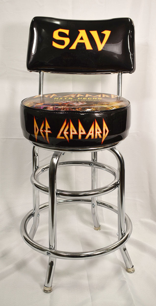 Rick Savage's very own personalized Def Leppard seat back bar stool with chrome legs. This bar stool was used on-stage during the Def Leppard Hits Vegas: The Sin City Residency at Planet Hollywood in Las Vegas, Nevada, 2019. Of the incredible 12-night residency, Sav joked, "we've got away with it!?” He added how much he especially loved the final show, “We've learned a lot of things along the way, and again we progress forward." From the collection of Def Leppard.