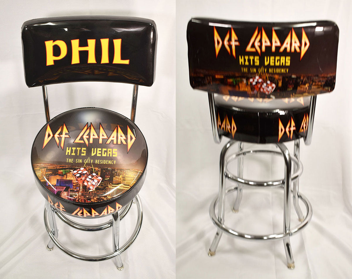 Phil Collen's very own personalized Def Leppard seat back bar stool with chrome legs. This bar stool was used on-stage during the Def Leppard Hits Vegas: The Sin City Residency at Planet Hollywood in Las Vegas, Nevada, 2019. Phil said of the scorching 12-night residency, "It was fantastic - we'd do this again. We actually loved it. It's great doing something that's different to what you normally do after 40 years. I think this was the best we've ever been." From the collection of Def Leppard.