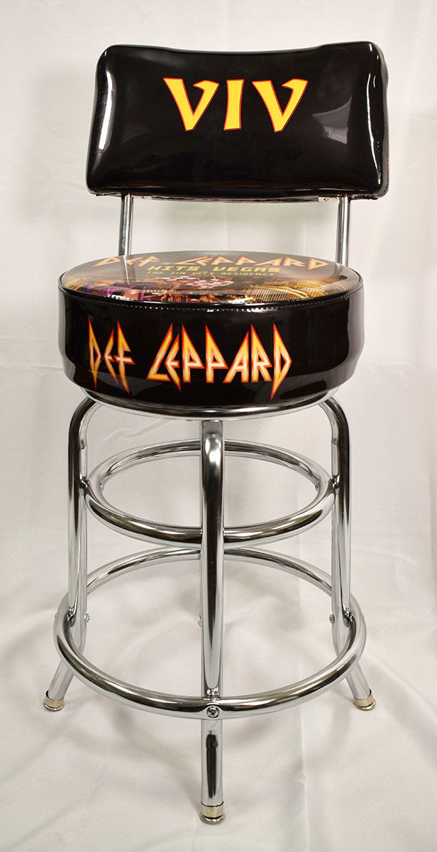 Vivian Campbell's very own personalized Def Leppard seat back bar stool with chrome legs. This bar stool was used on-stage during the Def Leppard Hits Vegas: The Sin City Residency at Planet Hollywood in Las Vegas, Nevada, 2019. Viv declared the scorching 12-night residency "like going on a 12km run every night - and that's fine." From the collection of Def Leppard.