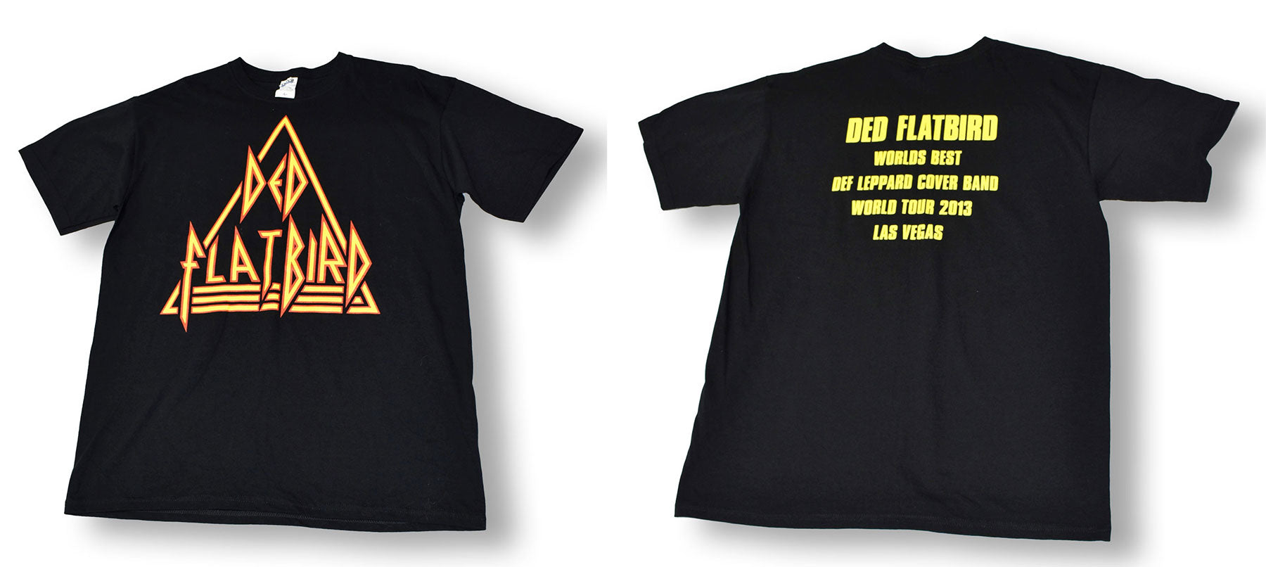 A deep cut merch rarity - this pristine shirt for "Ded FlatBird, the World's Best Def Leppard Cover Band, World Tour 2013 Las Vegas”. From the collection of Def Leppard.