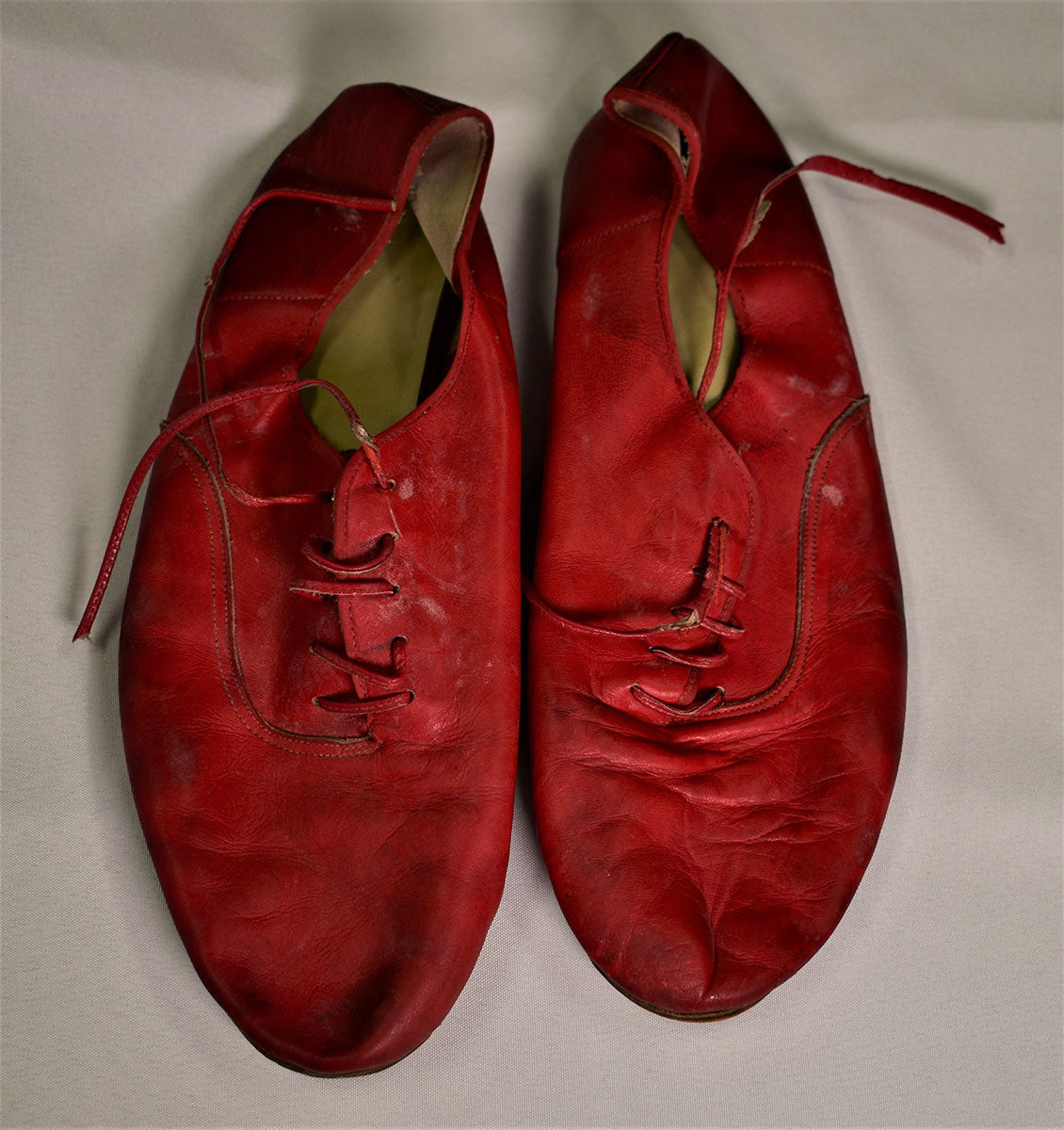 Worn pair of Le Papillon red leather shoes with matching red leather laces. And judging by the wear on the soles, Joe Elliott put them through their paces. From the Joe Elliott collection.