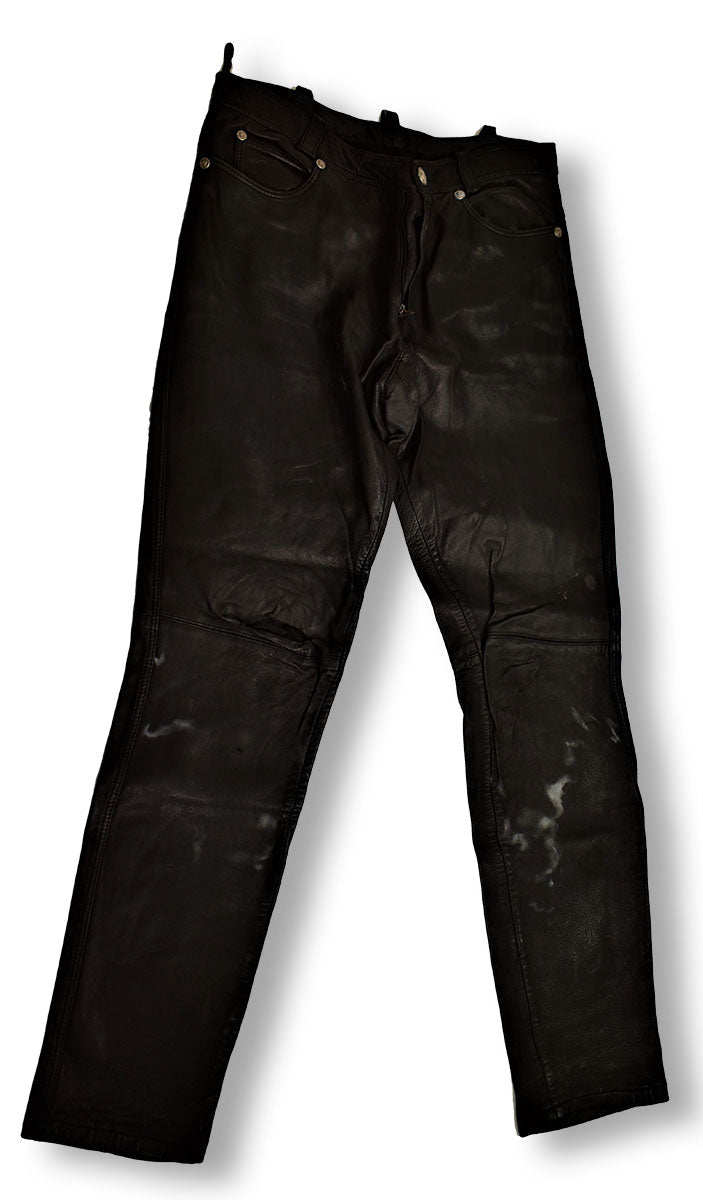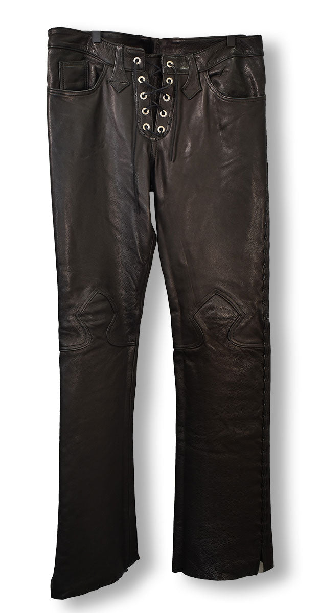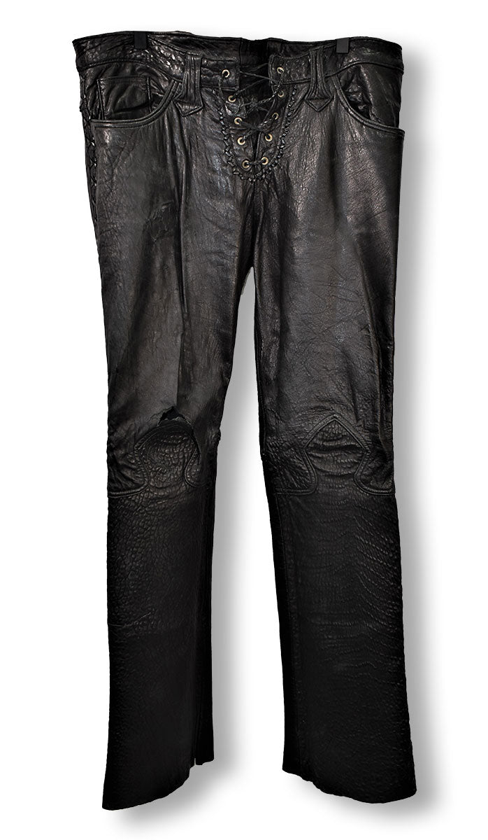Black leather pants featuring leather cross-stitching down the legs, unhemmed cuffs, leather lace-up fly, a spade design stitched on the knees, and cross-stitched leather on back pockets. A timeless rock-n-roll a staple. From the Joe Elliott collection.